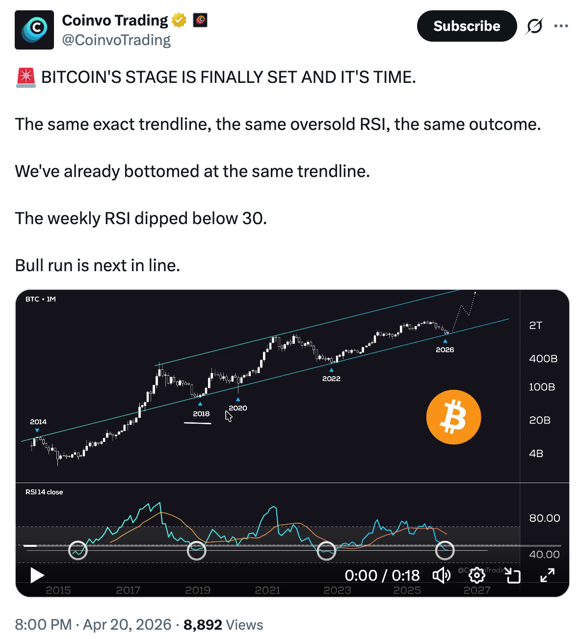 Meanwhile, Coinvo Trading shared a chart showing that Bitcoin’s monthly RSI has dropped to its lowest level since late 2022.