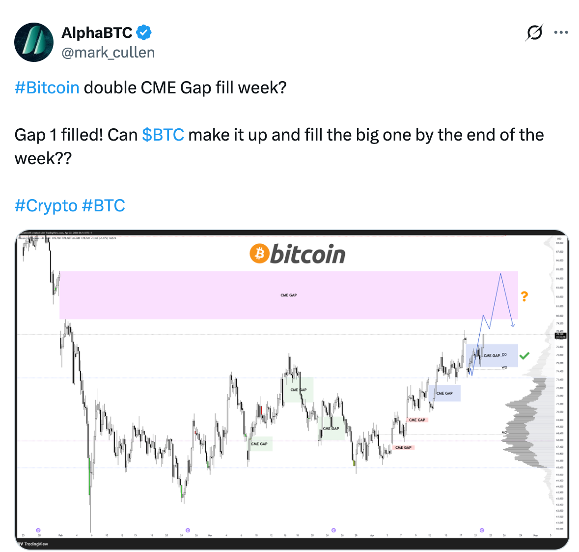 Traders are now looking at the next CME gap above $80,000, formed in early February.