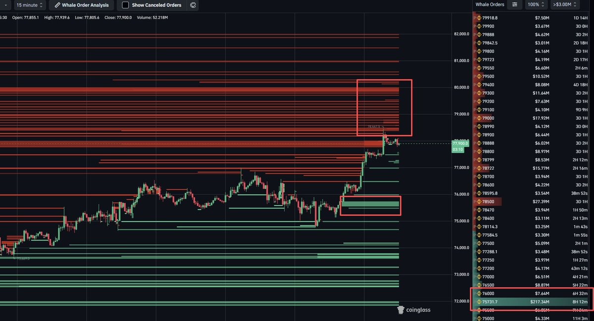 Meanwhile, Bitcoin’s whale order book showed “heavy sell pressure” between $78,000-$80,000, reinforcing the significance of this resistance level.