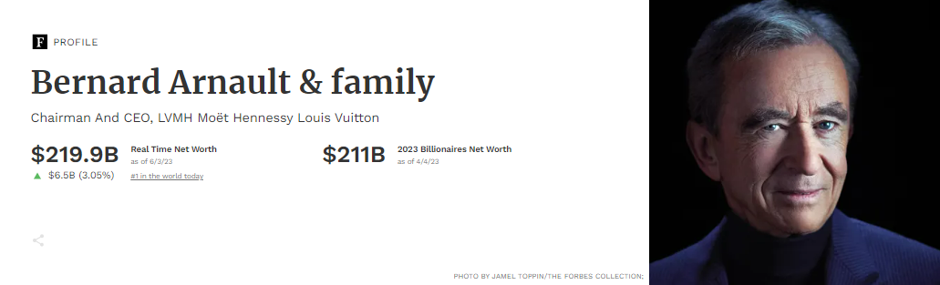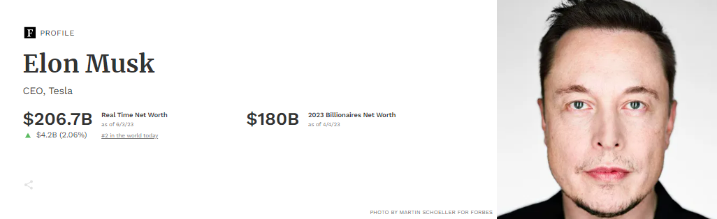 Na internete sa začali objavovať správy o tom, že Elon Musk je opäť v čele rebríčku najbohatších ľudí na svete, no podľa oficiálneho zoznamu Forbes to tak nie je. Najbohatším človekom je údajne Bernard Arnault s odhadovaným majetkom až 219,9 miliardy dolárov ku dňu 3.6.2023, zatiaľ čo Muskov odhadovaný majetok v rovnakom čase dosahuje 206,7 miliardy dolárov.
