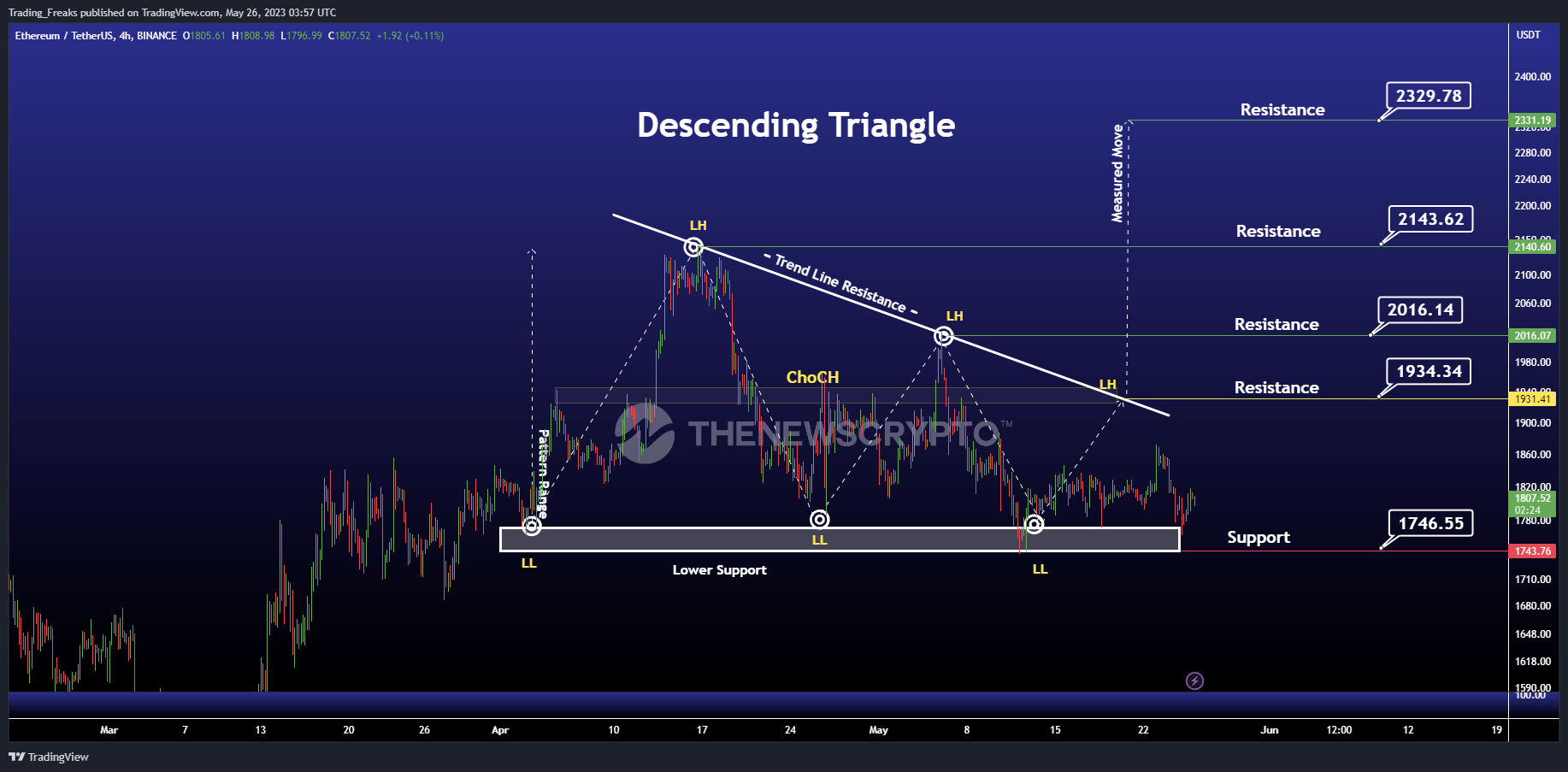 Na vyššie uvedenom grafe Etherea (ETH) je znázornený klesajúci trojuholník. Zostupný trojuholník sa najčastejšie vyskytuje počas klesajúcich trendov a často sa interpretuje ako medvedí signál. Vzor vzostupného trojuholníka je v zostupnom trojuholníku obrátený.