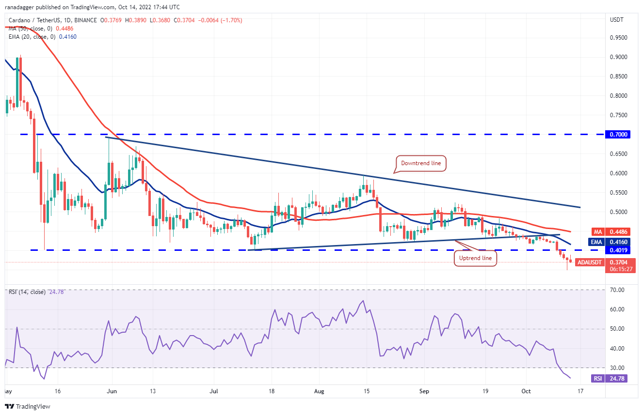 Cardano (ADA) found buying support at $0.35 on Oct. 13 but the bulls are struggling to push the price above the breakdown level of $0.40 on Oct. 14.