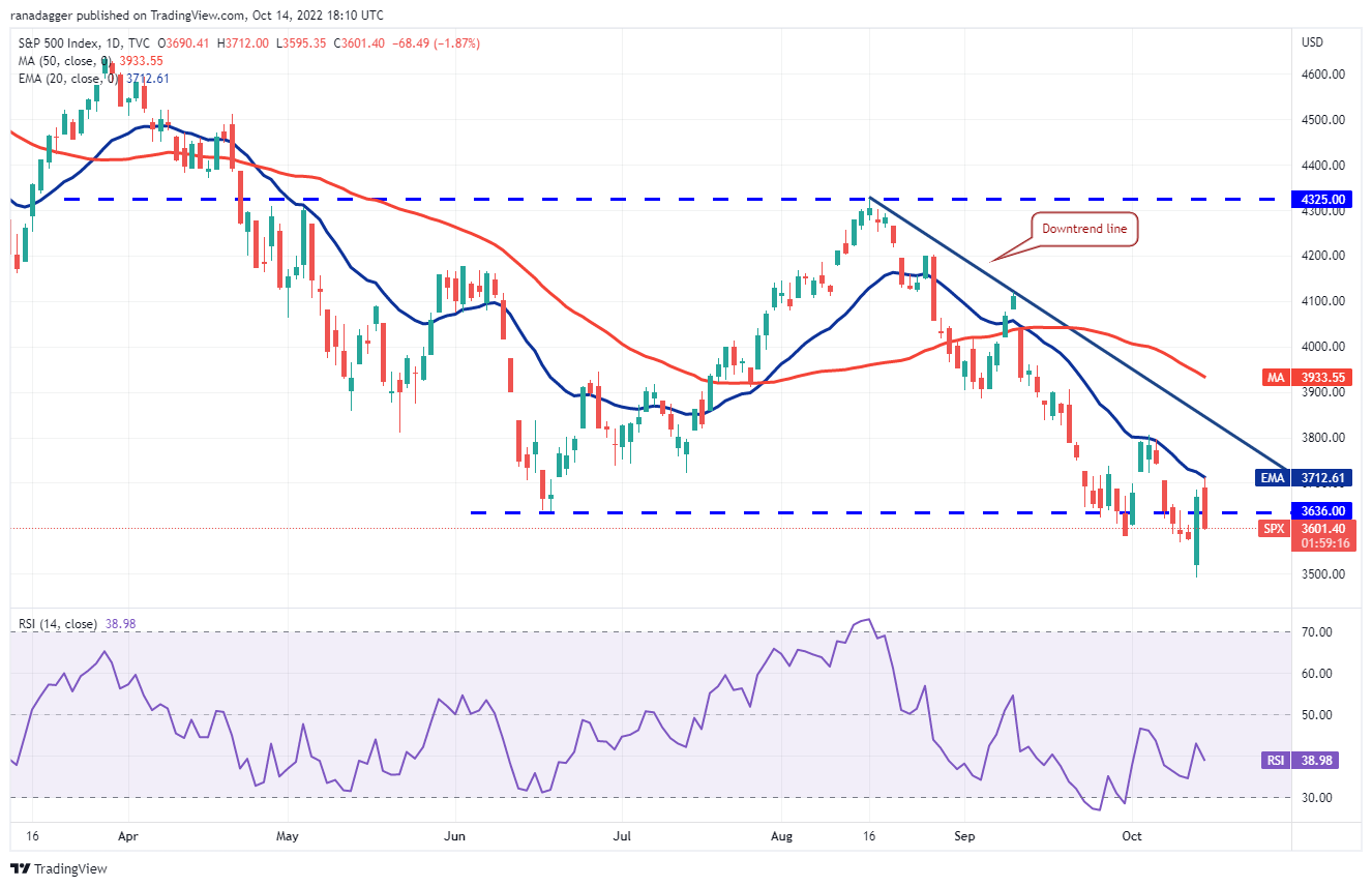 The S&P 500 index (SPX) gapped down on Oct. 13 and dropped to $3,491 but lower levels attracted huge buying by the bulls. That may have caught several aggressive bears on the wrong paw and they might have scrambled to cover their short positions. That propelled the index back above the breakdown level of $3,636.