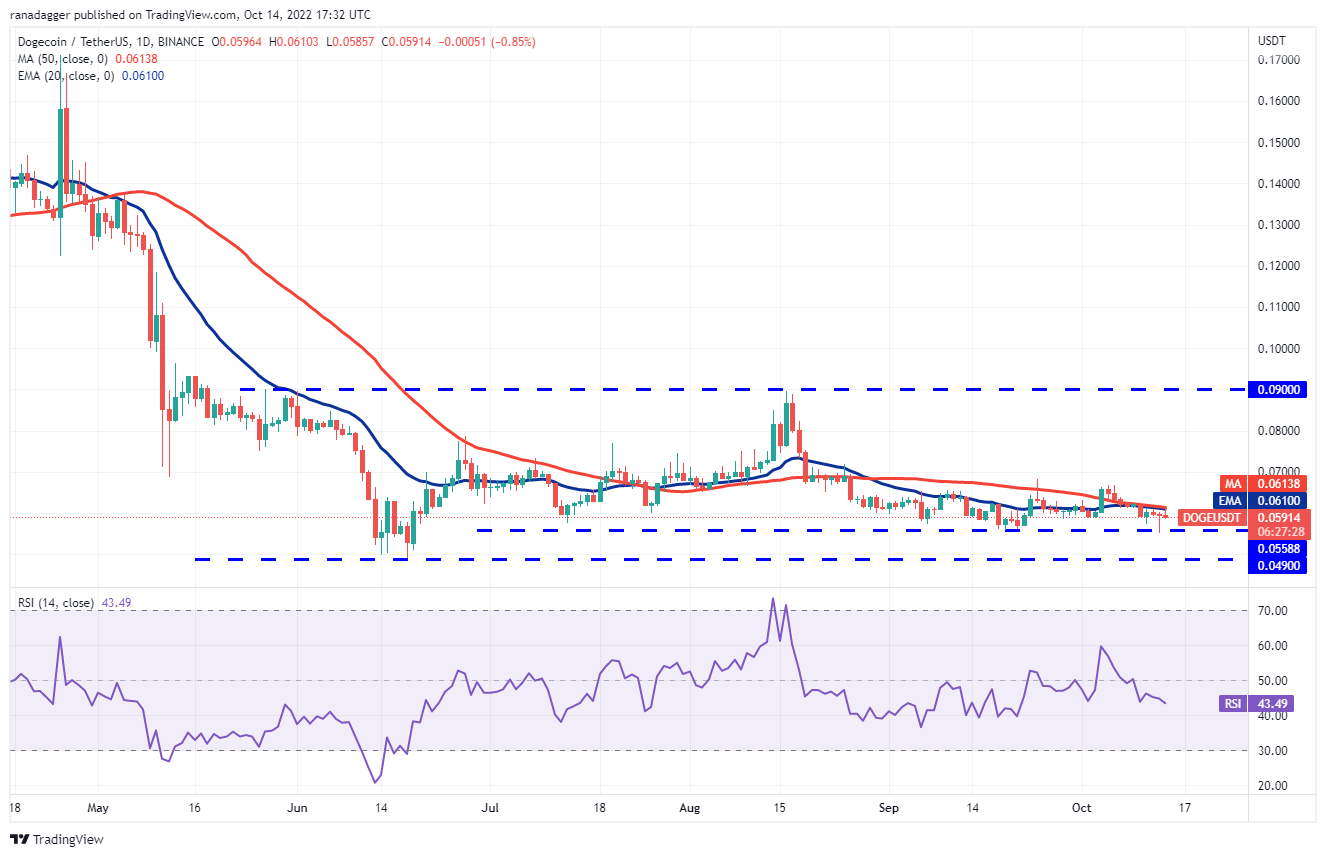 Dogecoin (DOGE) rebounded off the strong support near $0.06 on Oct. 13, indicating that the bulls are defending the level aggressively. Buyers are trying to propel the price above the moving averages on Oct. 14.