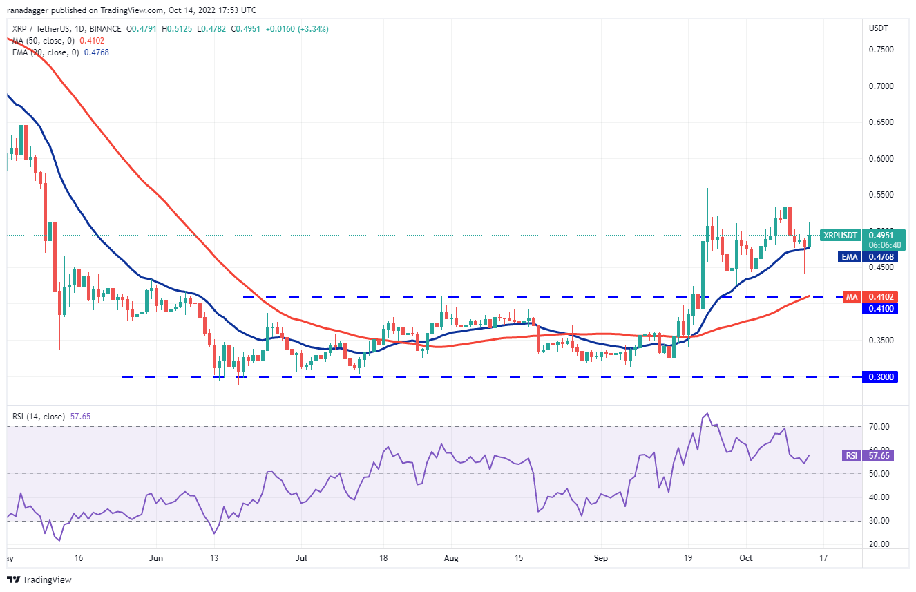 XRP (XRP) broke below the 20-day EMA ($0.47) on Oct. 13 but the bears could not sustain the lower levels. The bulls purchased the dip and pushed the price back above the 20-day EMA.