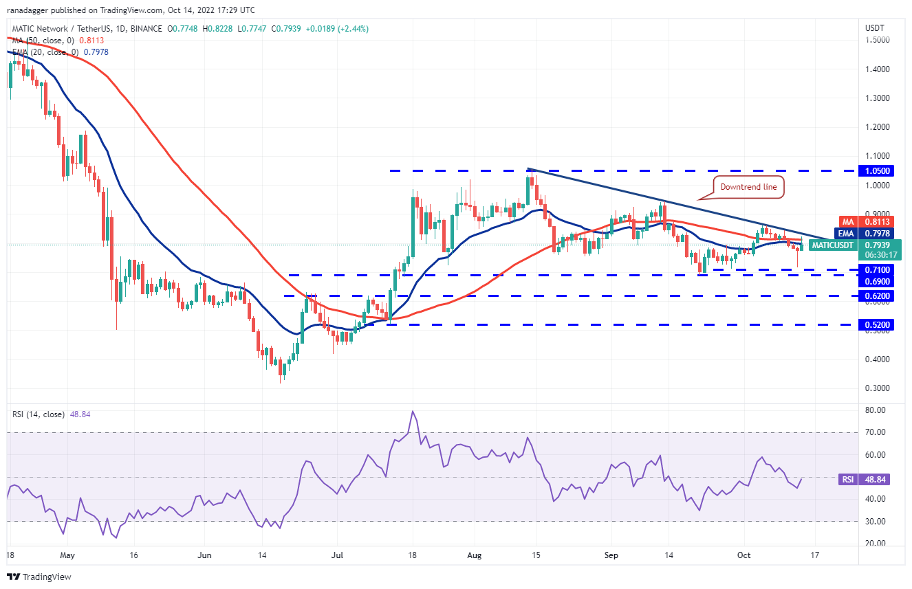 The long tail on Polygon’s (MATIC) Oct. 13 candlestick shows that bulls are aggressively buying near the $0.71 to $0.69 support zone. Buyers continued their momentum on Oct. 14 and tried to push the price above the downtrend line but the bears held their ground.