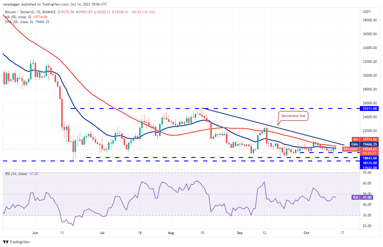 Buyers pushed the price above the moving averages on Oct. 14 but the up-move is facing stiff resistance at the downtrend line. The 20-day EMA ($19,466) is flattening out and the relative strength index (RSI) is near the midpoint, indicating equilibrium between buyers and sellers.
