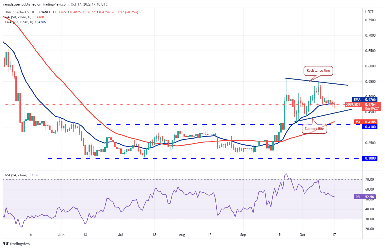 If the price sustains below the 20-day EMA ($0.47), the XRP/USDT pair could slide to the support line of the triangle. This level could attract buyers and a strong rebound off it will suggest that the pair may continue to trade inside the triangle. On the other hand, a break below the support line could sink the pair to $0.41.