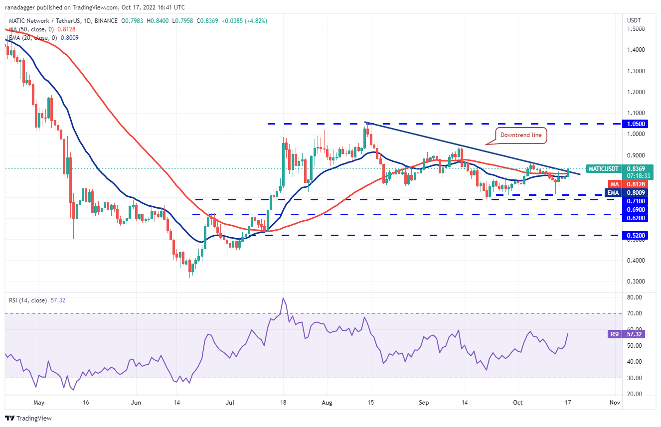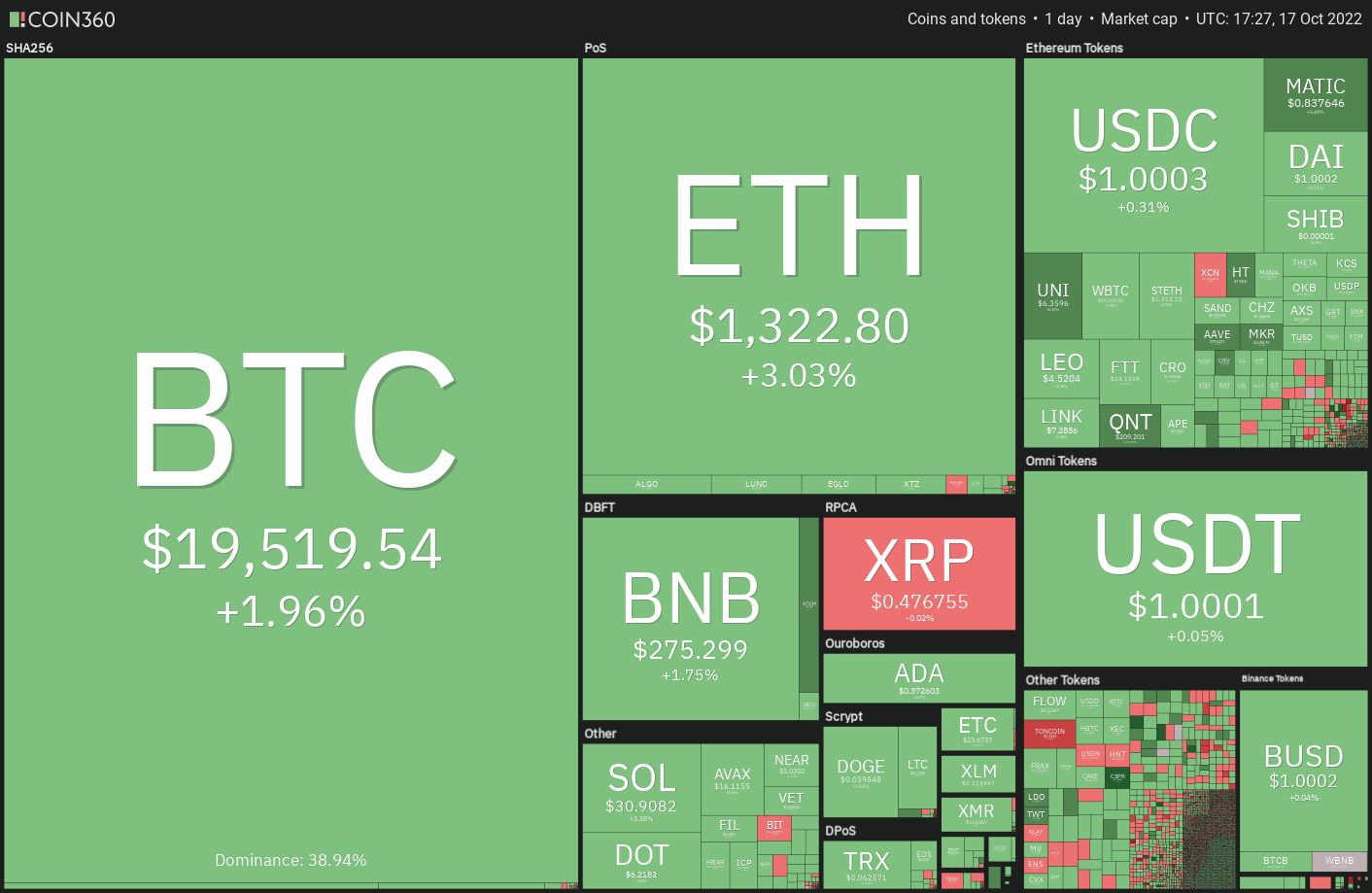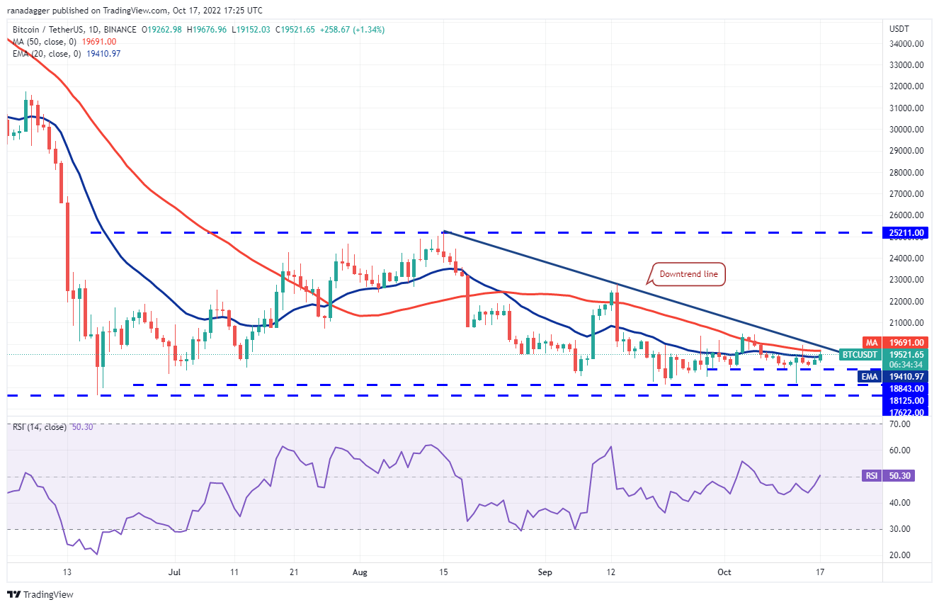 Bitcoin broke above the 20-day exponential moving average ($19,410) on Oct. 17 and the bulls are trying to extend the recovery above the zone between the 50-day simple moving average ($19,691) and the downtrend line.