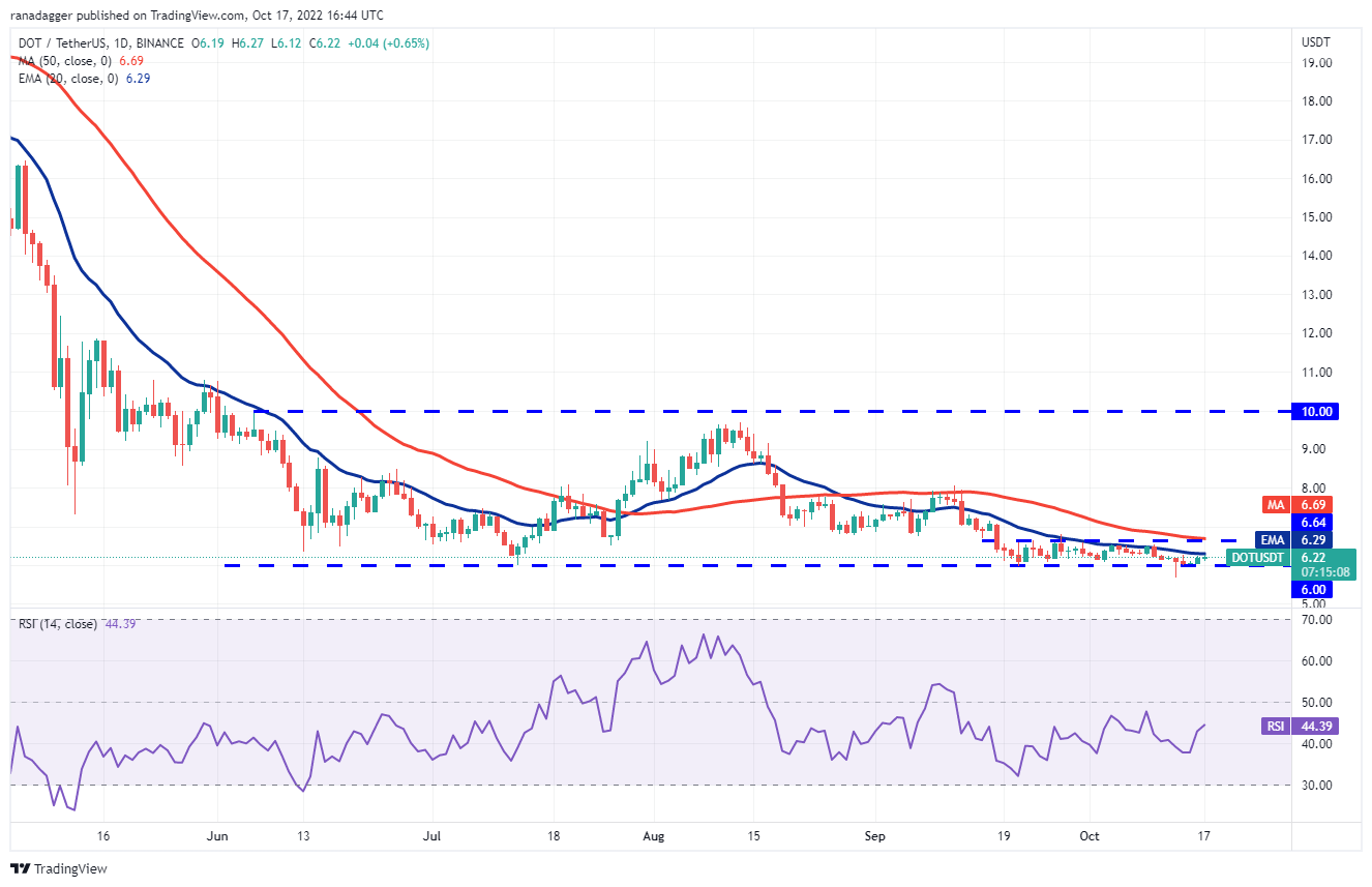 The failure of the bears to sustain Polkadot (DOT) below $6 on Oct. 13 started a recovery that has reached the 20-day EMA ($6.29) on Oct. 17. This level is likely to witness a tough battle between the bulls and the bears.