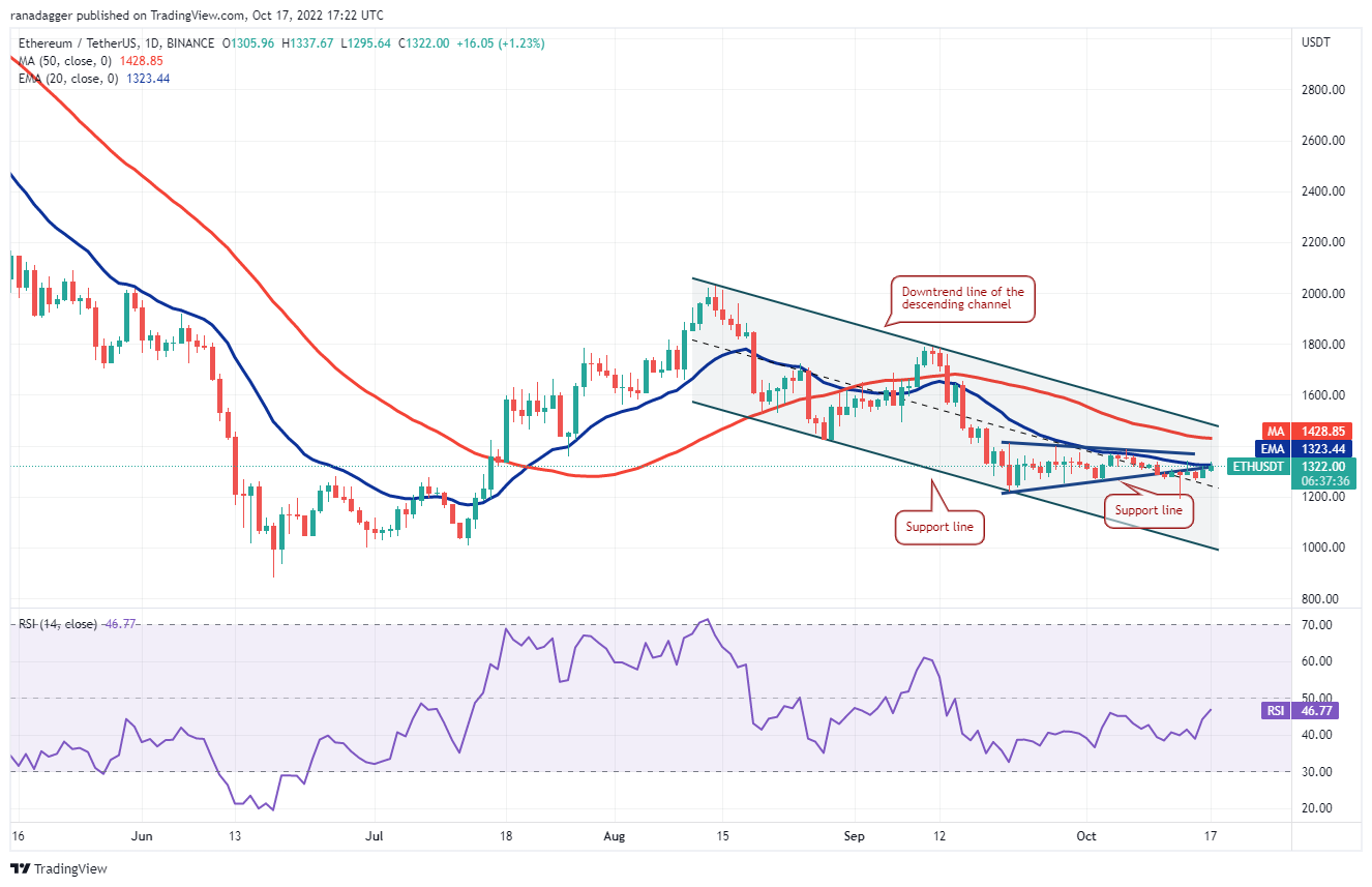 Ether’s (ETH) recovery has reached the breakdown level from the triangle. The 20-day EMA ($1,323) is located close to this level hence the bears are expected to defend the level aggressively.