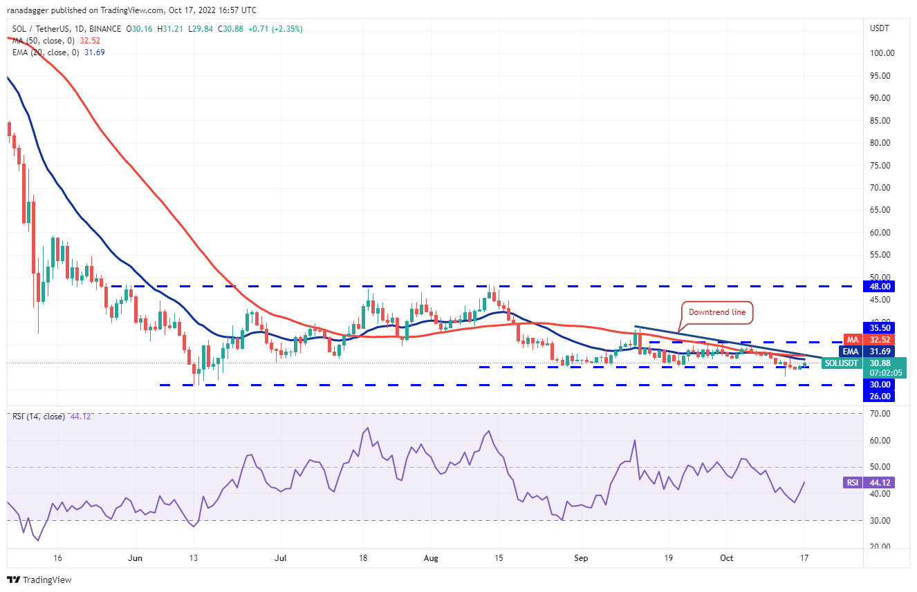 Solana (SOL) dipped and closed below the $30 support on Oct. 15 but the bears could not capitalize on this weakness. This suggests that selling dries up at lower levels.