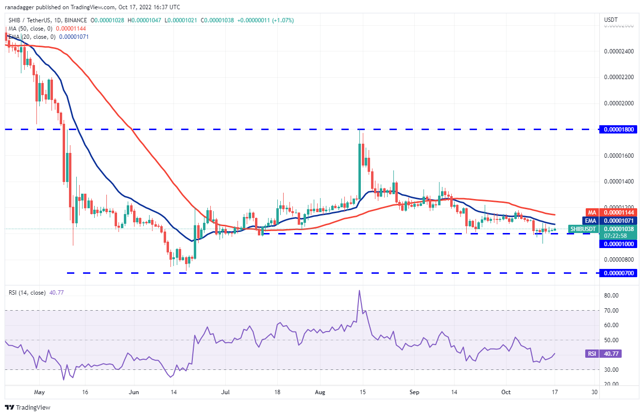 Both moving averages are sloping down and the RSI is in the negative territory, indicating advantage to sellers. If the price turns down from the current level or the moving averages, the bears will again try to sink the SHIB/USDT pair below $0.000010. If they manage to do that, the selling could intensify and the pair may drop toward the vital support at $0.000007.