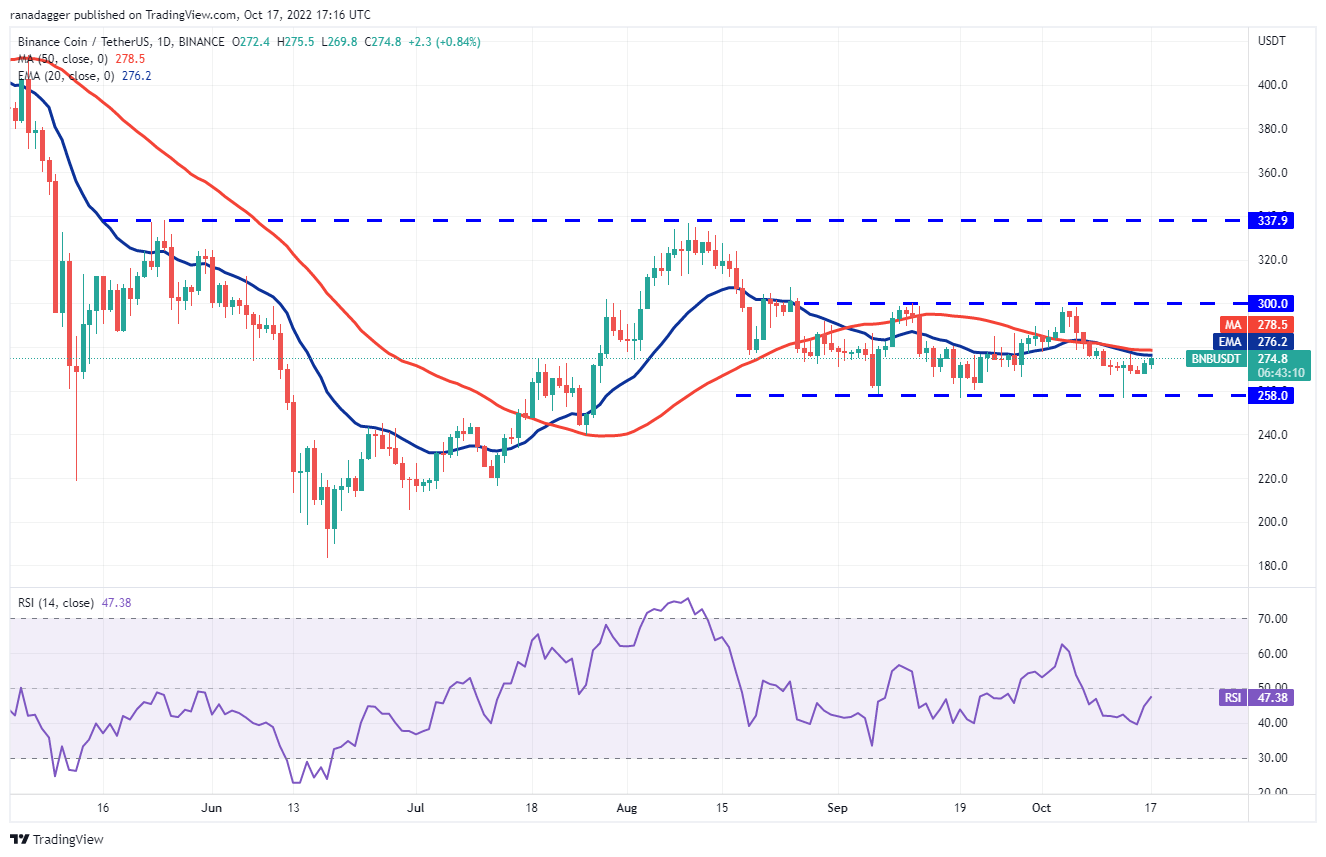BNB (BNB) has been consolidating between $258 and $300 for the past several days. The bulls are trying to push the price above the moving averages on Oct. 17.