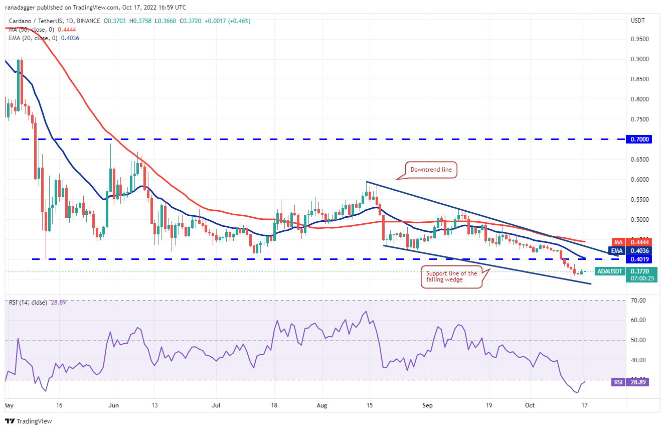 Cardano (ADA) has formed a falling wedge pattern. The price bounced off the support line of the wedge on Oct. 13 and the bulls are attempting to push the price to the 20-day EMA ($0.40).