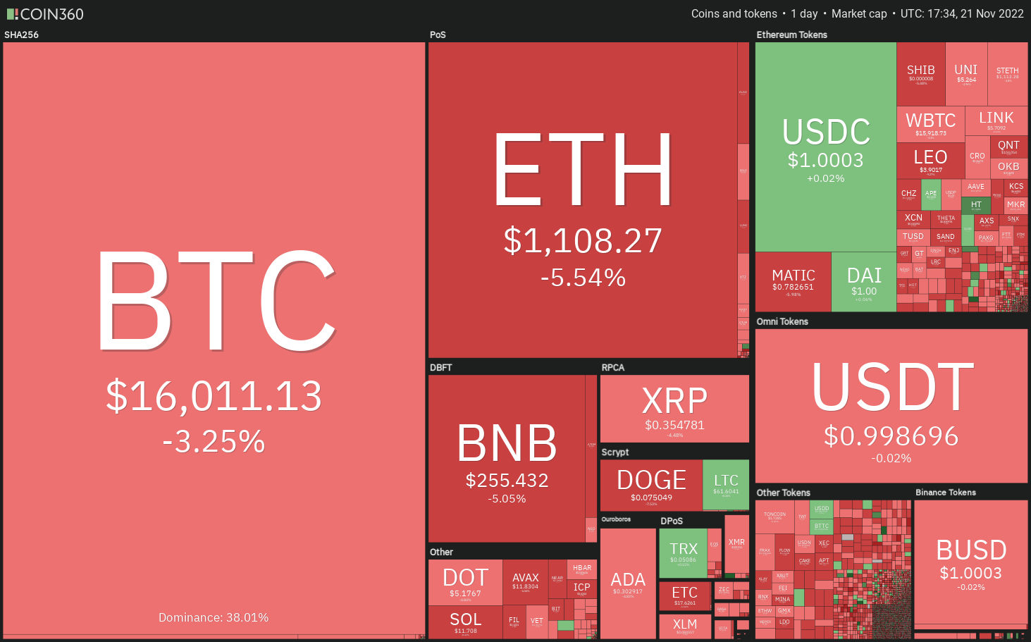 Bitcoin remains in a downtrend. The bears pulled the price below the immediate support of $16,229 on Nov. 21, which suggests a lack of demand from the bulls.