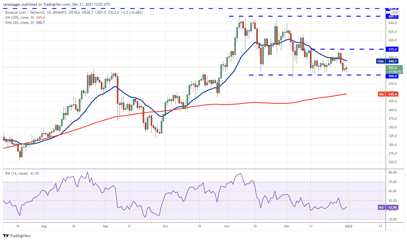 Binance Coin (BNB) is attempting a bounce off the strong support at $500. The recovery is likely to face selling at the 20-day EMA ($540). If the price turns down from this level, it will suggest that the sentiment remains negative and traders are selling on rallies.
