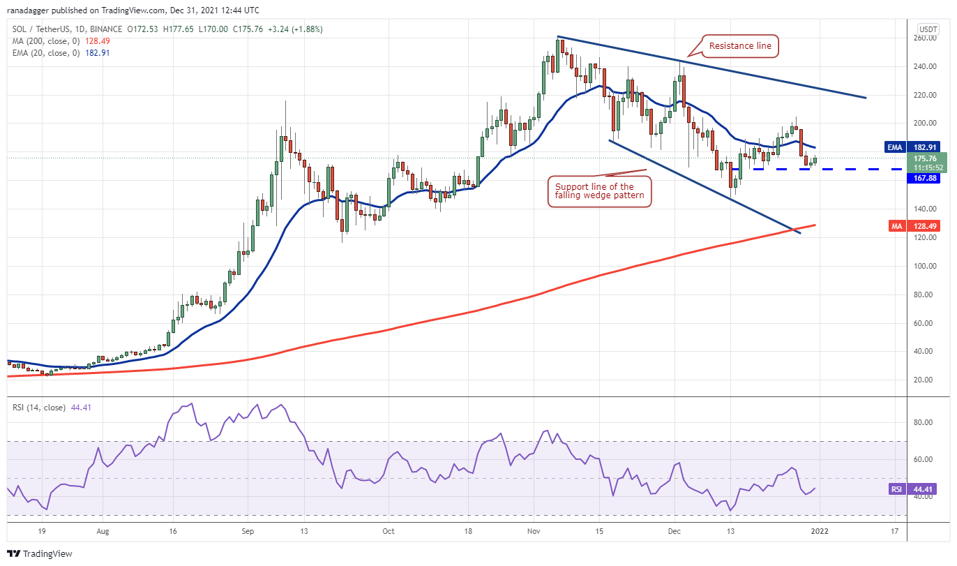 Solana (SOL) is attempting to bounce off $167.88. The relief rally is likely to face strong selling at the 20-day EMA ($182). The RSI is in the negative zone and the 20-day EMA is sloping down gradually, indicating that bears are at an advantage.