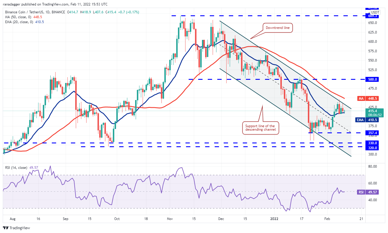 The flattish 20-day EMA ($410) and the RSI near the midpoint suggest a balance between supply and demand. If the price breaks below the 20-day EMA, it will increase the prospects of the BNB/USDT pair staying inside the channel for a few more days. The pair could first slip to $390 and then continue its downward move to $357.40.