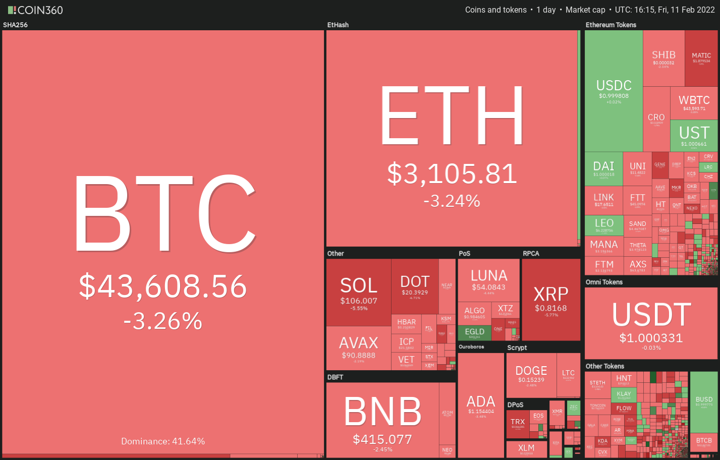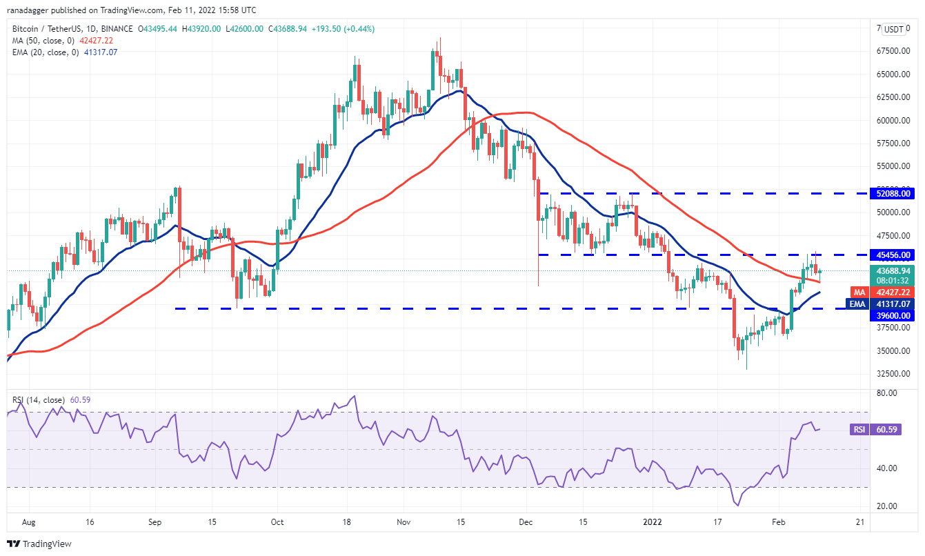 Bitcoin turned down from the overhead resistance at $45,456 on Feb. 10, indicating that bulls continue to defend the level aggressively. A minor positive is that bulls have not allowed the price to break below the 50-day simple moving average ($42,427).