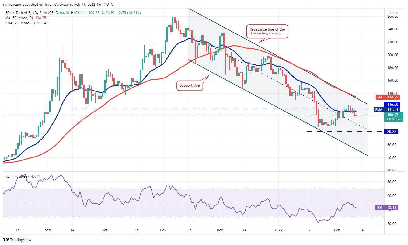 Solana (SOL) turned down from the overhead resistance at $116 and broke back below the 20-day EMA ($111) on Feb. 10. This suggests that the sentiment remains negative and bears are selling on rallies to resistance levels.