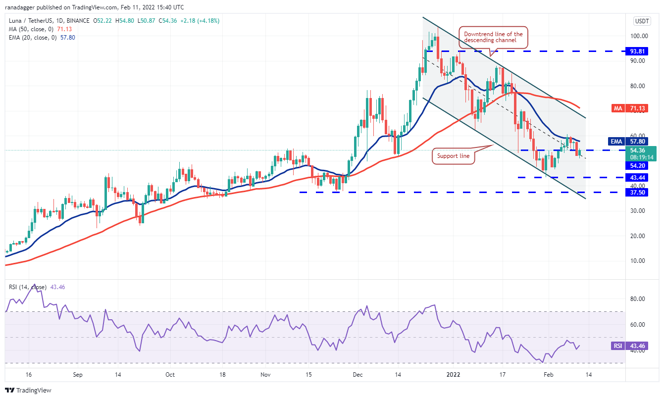 The bulls have repeatedly failed to push Terra’s LUNA token above the 20-day EMA ($57.80) in the past few days, which suggests that bears are defending the level aggressively. Hence, this becomes a key resistance to watch on the upside.
