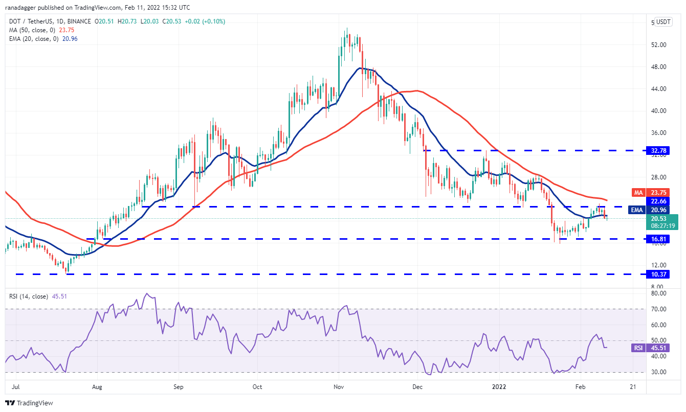 Polkadot (DOT) slipped and closed below the 20-day EMA ($20.96) on Feb. 10, indicating that bears are aggressively defending the overhead resistance zone between $22.66 and the 50-day SMA ($23.75).