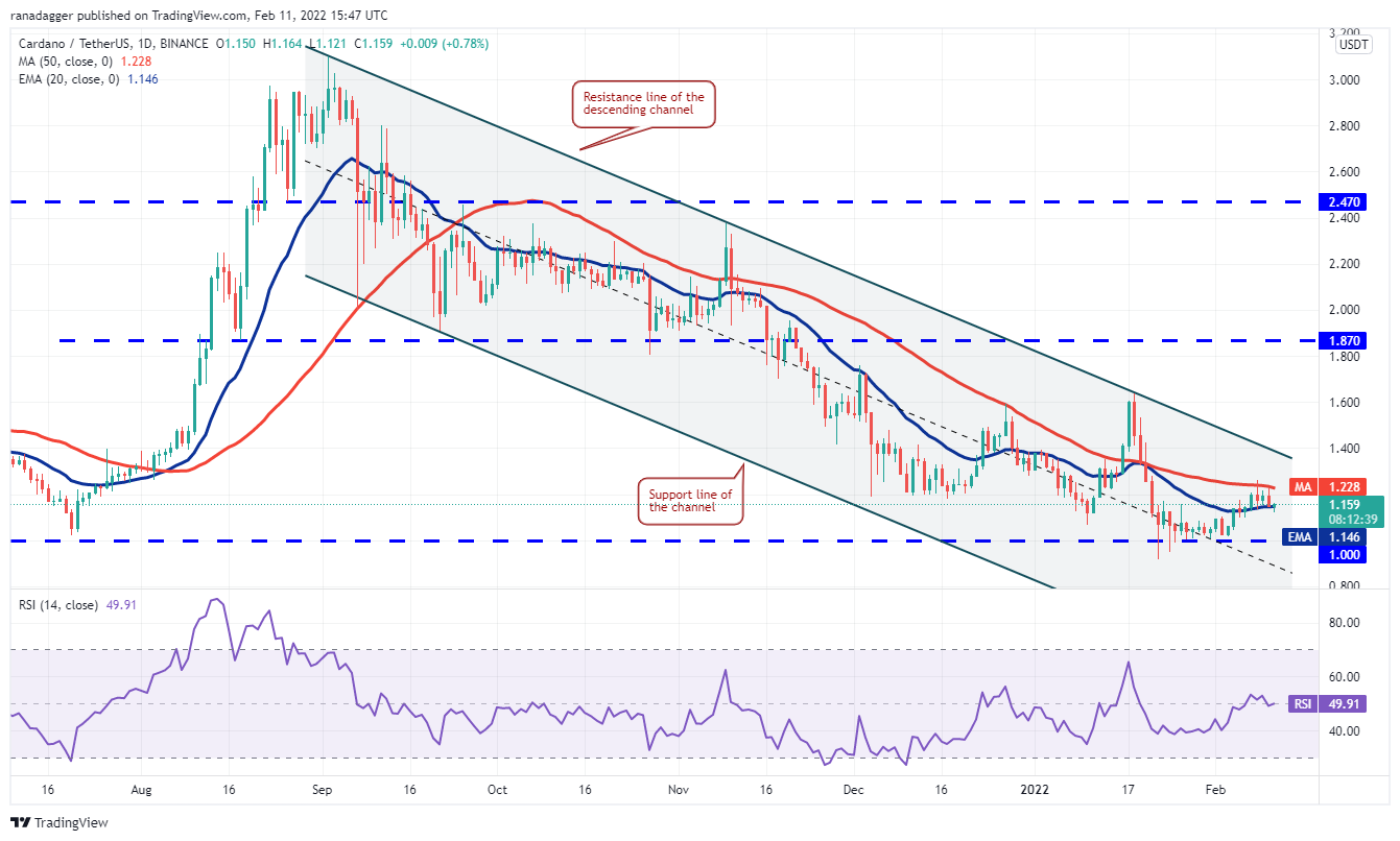 Dogecoin (DOGE) again stumbled at the 50-day SMA ($0.15) on Feb. 9 and 10, indicating that bears are aggressively defending this resistance. Both moving averages are flattening out and the RSI is near the midpoint, suggesting a range-bound action in the short term.