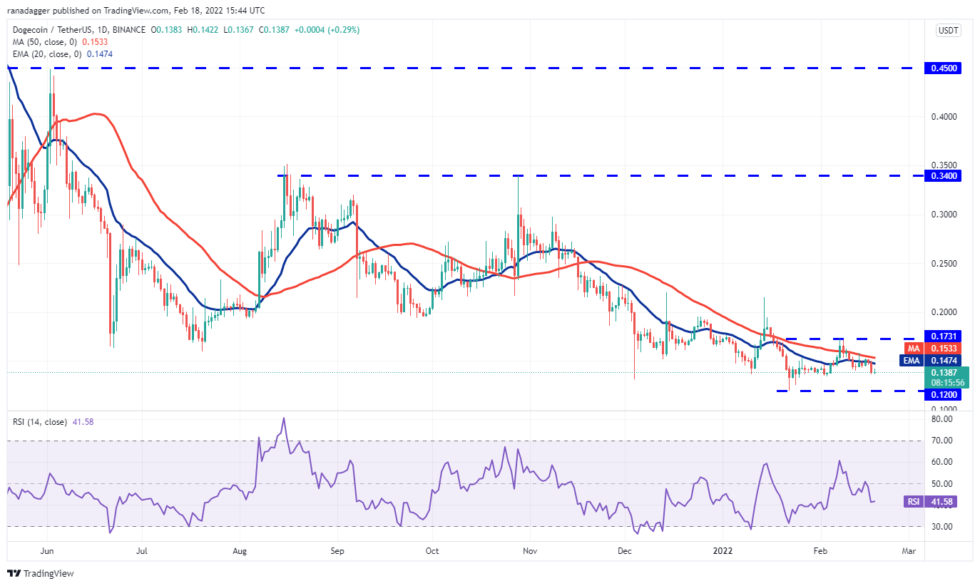 Dogecoin (DOGE) turned down from the 50-day SMA ($0.15) on Feb. 16, suggesting that bears are selling on relief rallies to this resistance.