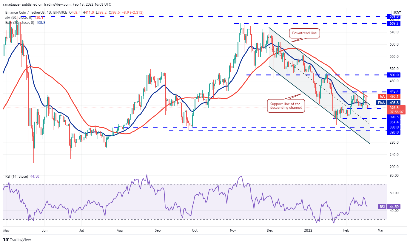Binance Coin (BNB) turned down from the 50-day simple moving average ($430) on Feb. 16 and broke below the 20-day EMA ($408) on Feb. 17.