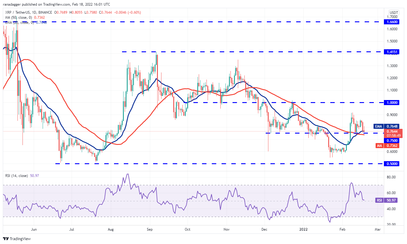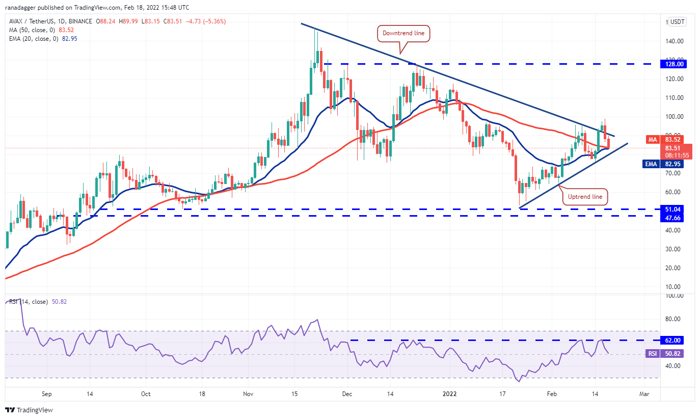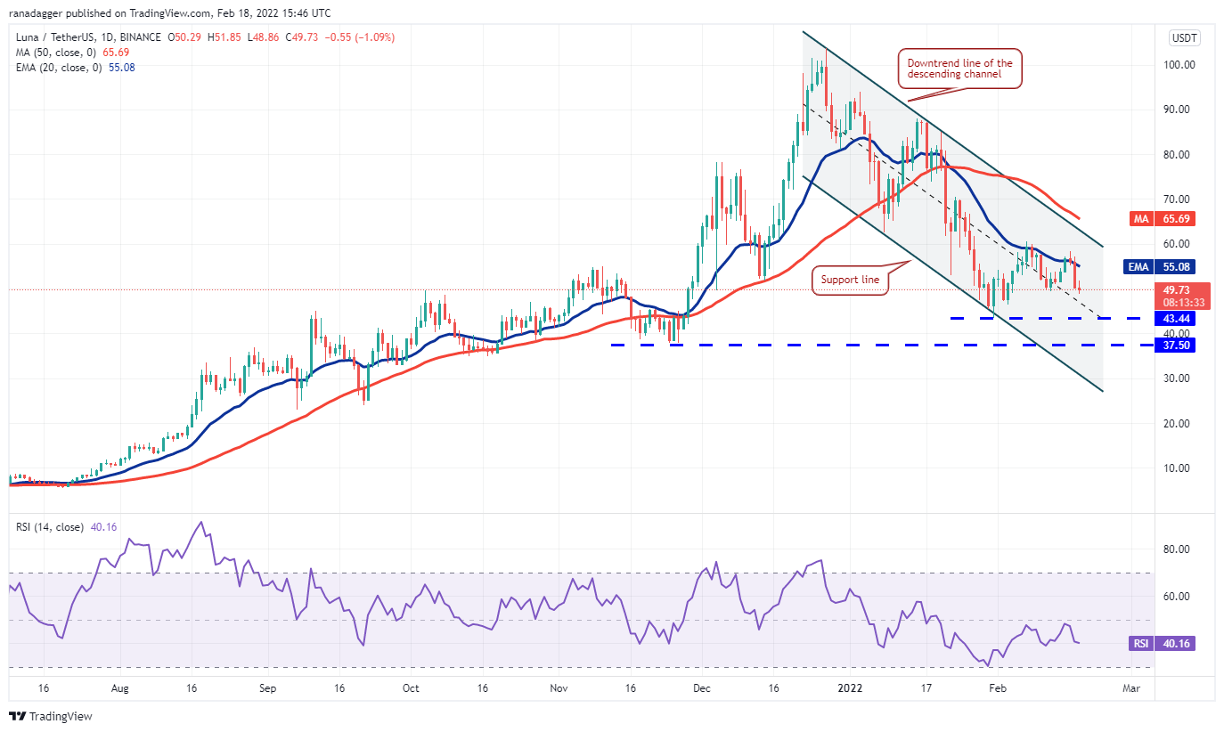 Terra’s LUNA token broke and closed above the 20-day EMA ($55) on Feb. 15, but the bulls could not sustain the higher levels. This may have attracted selling by the short-term traders, which has pulled the price back below the 20-day EMA.