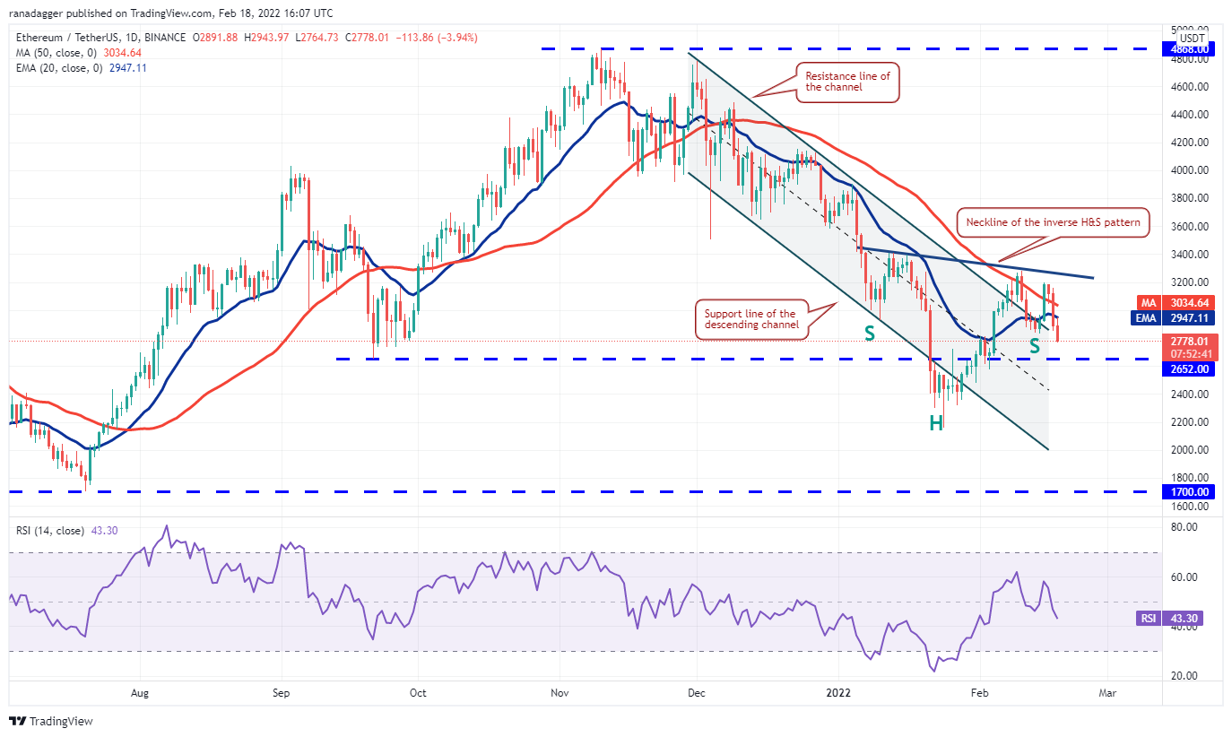 Ether (ETH) turned down from close to the neckline of the developing inverse head and shoulders pattern on Feb. 16. This suggests that bears are trying their best to invalidate the possible reversal setup.