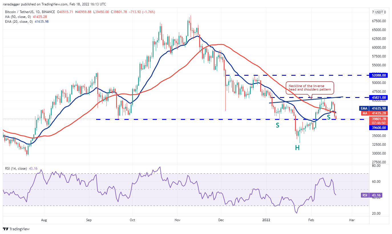 Bitcoin plunged below the moving averages on Feb. 17, indicating that bears are in no mood to relent and are selling on rallies. The price is near $39,600, which is an important level for the bulls to defend.