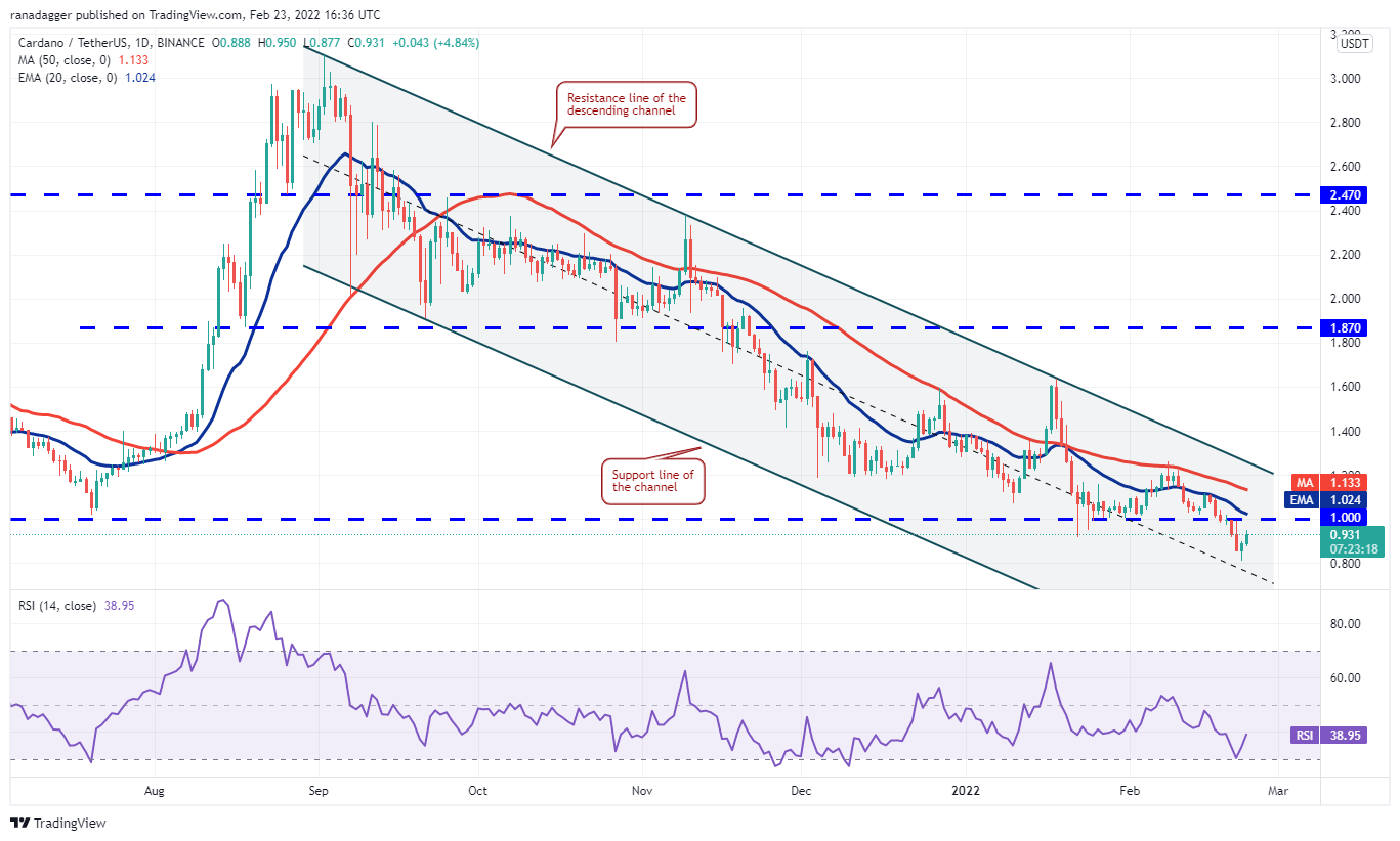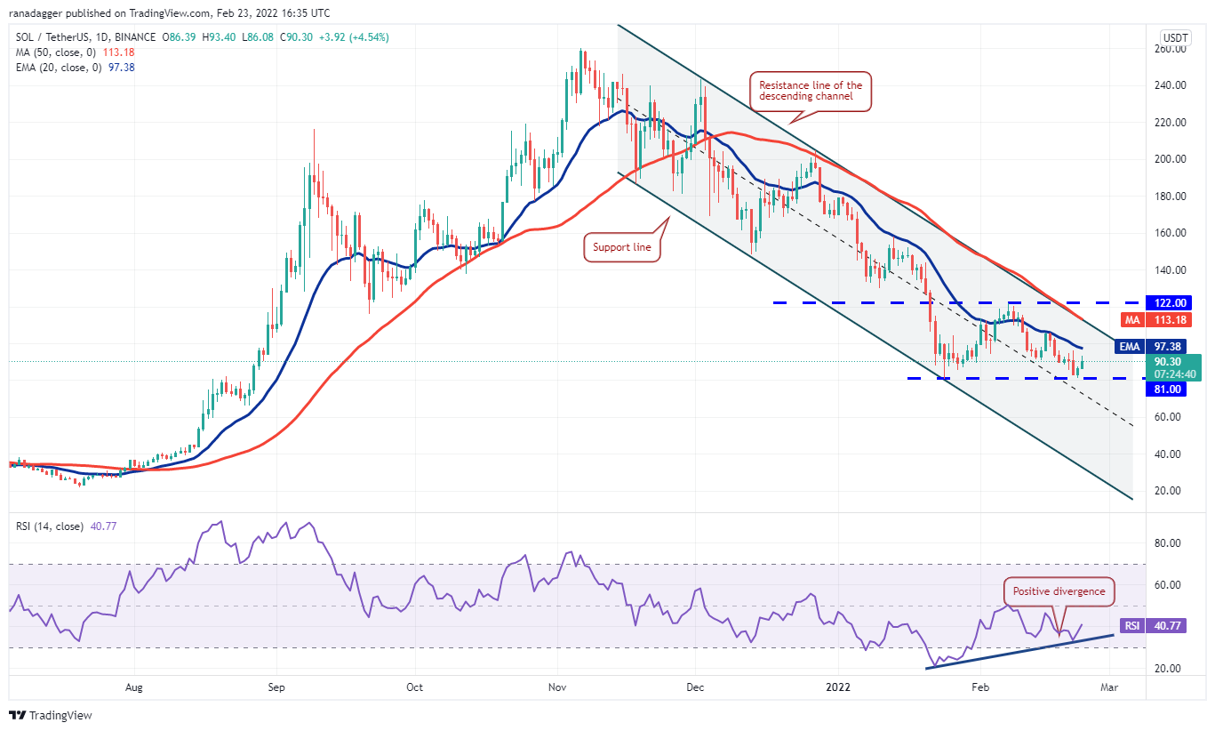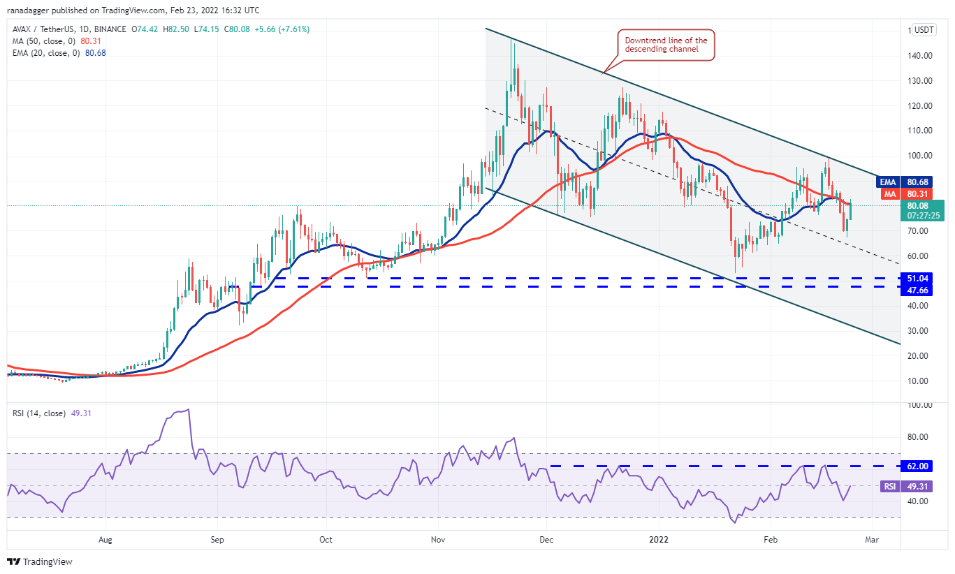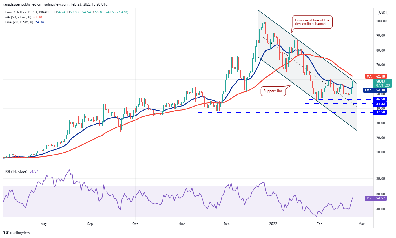 Terra’s LUNA token broke and closed above the 20-day EMA ($54) on Feb. 22 which was the first indication that the sellers may be losing their grip. Sustained buying has pushed the price to the downtrend line of the descending channel.