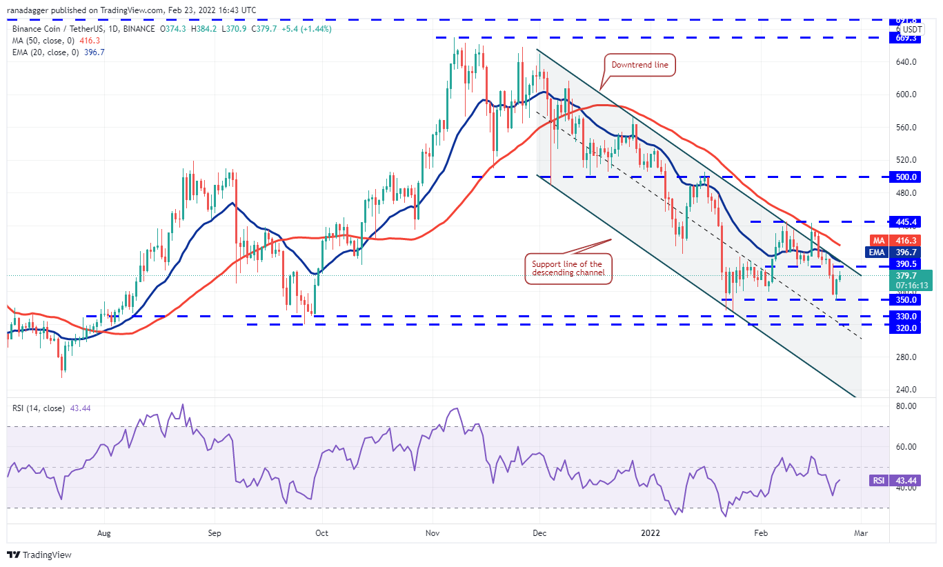 Binance Coin (BNB) bounced off the strong support at $350 on Feb. 22 indicating that bulls have not given up and they continue to buy at lower levels. The bulls will now attempt to drive the price above the downtrend line of the descending channel.