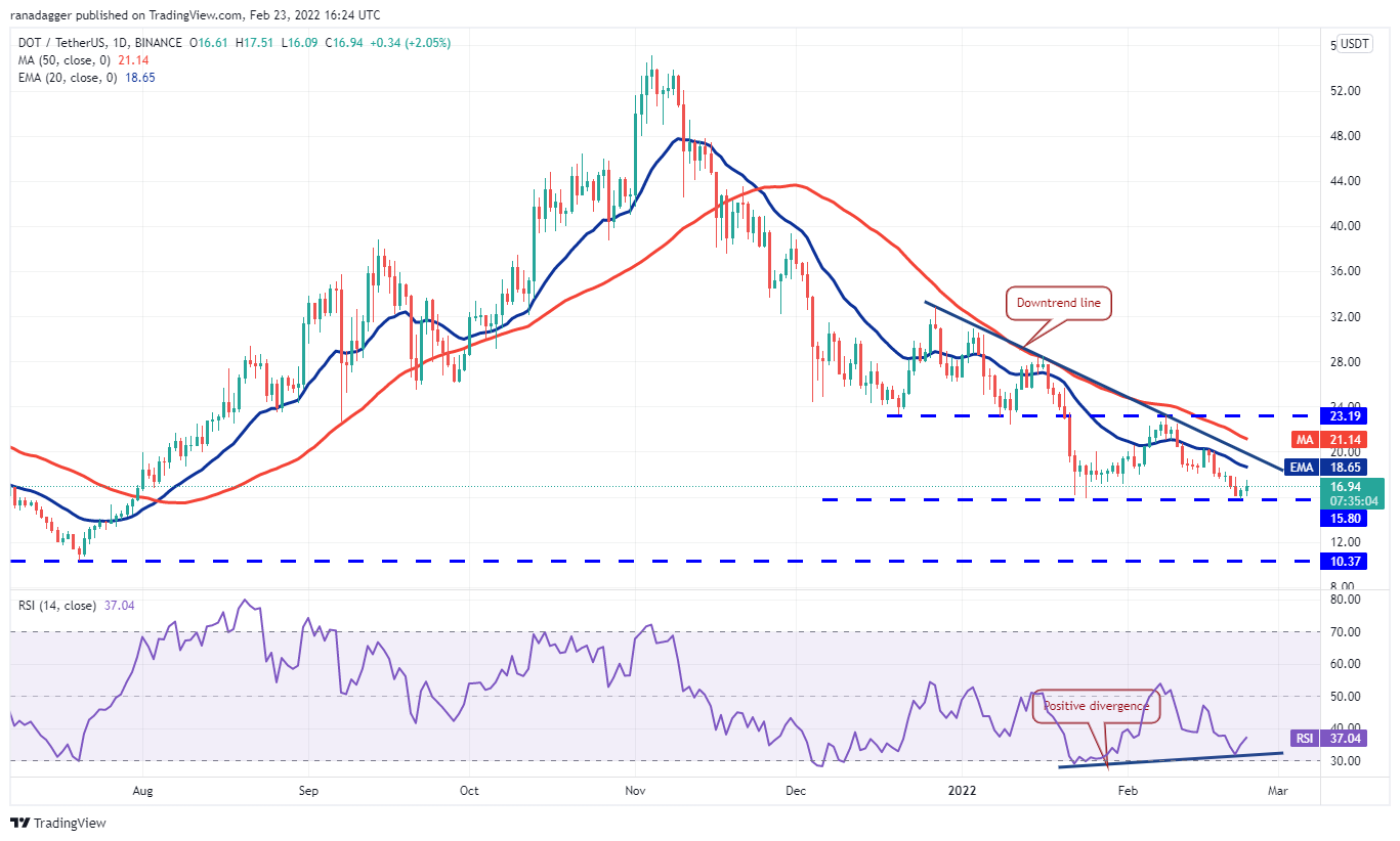 The DOT/USDT pair could now rise to the downtrend line, which is likely to act as a strong resistance. If the price turns down from this level, the bears will again attempt to pull the pair below $15.80 and resume the downtrend.