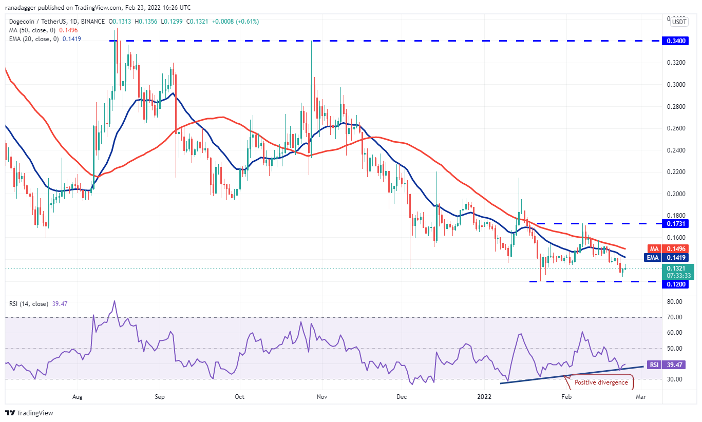 Dogecoin (DOGE) rebounded off the strong support at $0.12 on Feb. 12, suggesting that the bulls have not yet given up and are buying on dips.