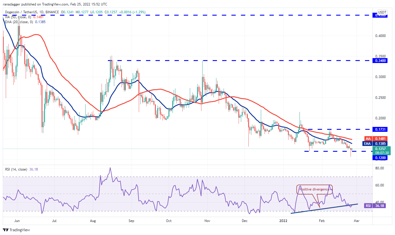 Dogecoin (DOGE) rebounded off the strong support at $0.10 on Feb. 24 and closed above the breakdown level at $0.12. However, the bulls have not been able to sustain the buying momentum, indicating a lack of demand at higher levels.