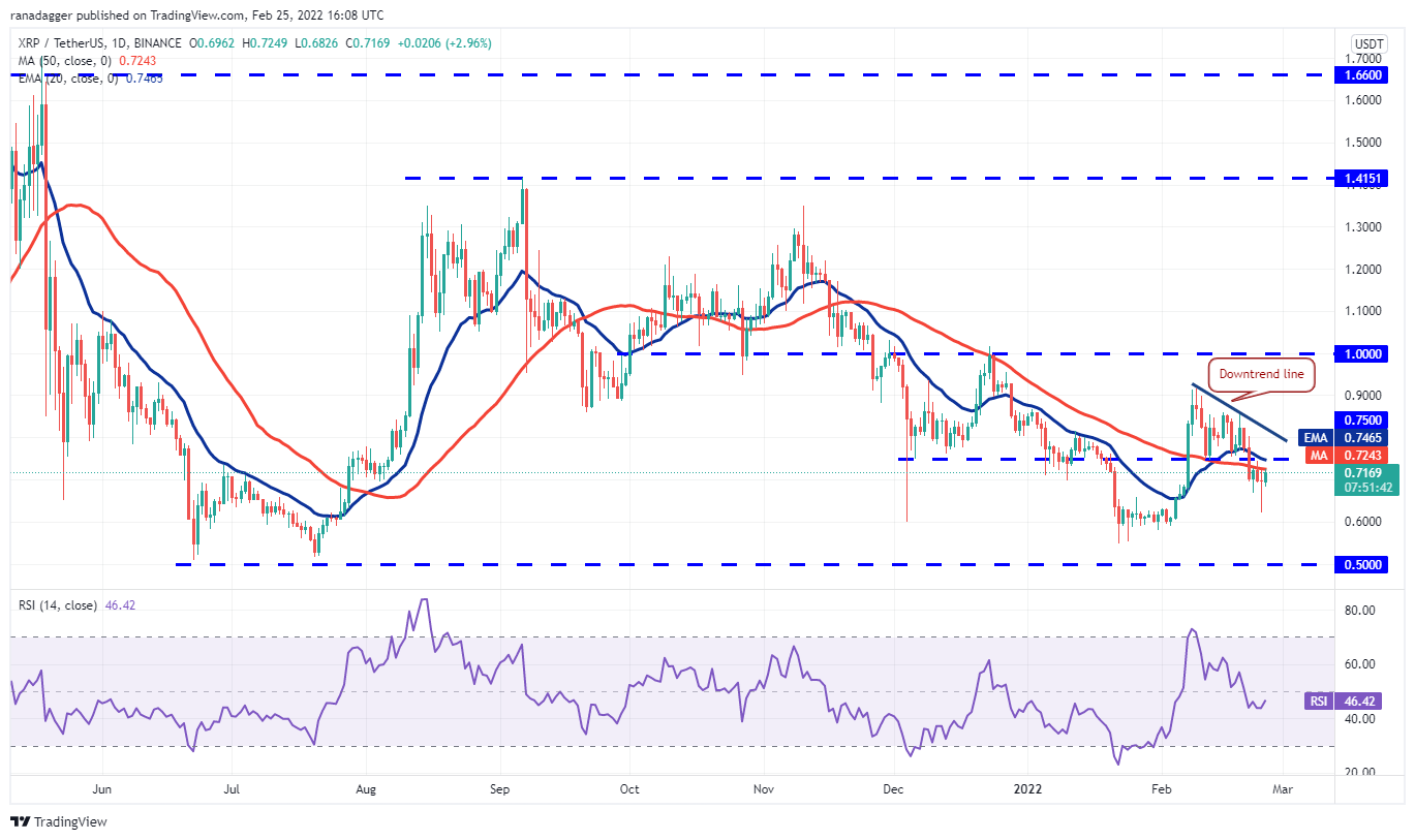 Ripple (XRP) rebounded off the $0.62 support on Feb. 24 but the bulls could not push the price above the overhead resistance at the 50-day SMA ($0.72). This resulted in the formation of a long-legged Doji candlestick pattern.