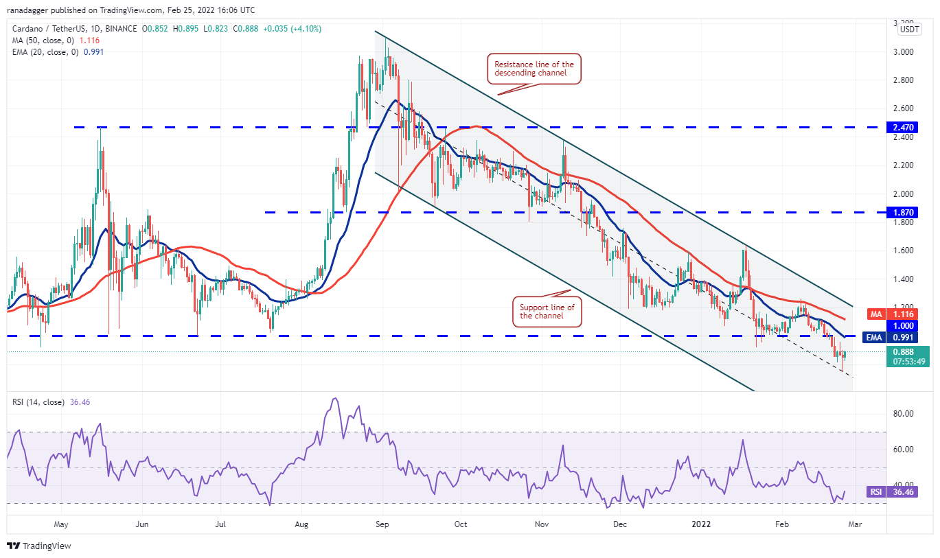 Cardano (ADA) continues to be in a strong downtrend and the price has been trading below the critical level at $1 for the past few days. The long tail on Feb. 25 candlestick shows that bulls bought the dip to $0.74.