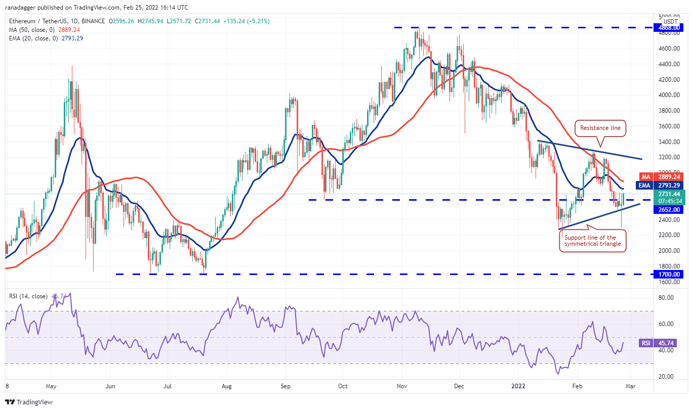 Ether (ETH) broke below the support line of the symmetrical triangle on Feb. 24 but the bears could not sustain the lower levels. The long tail on the day’s candlestick indicates strong buying at lower levels.