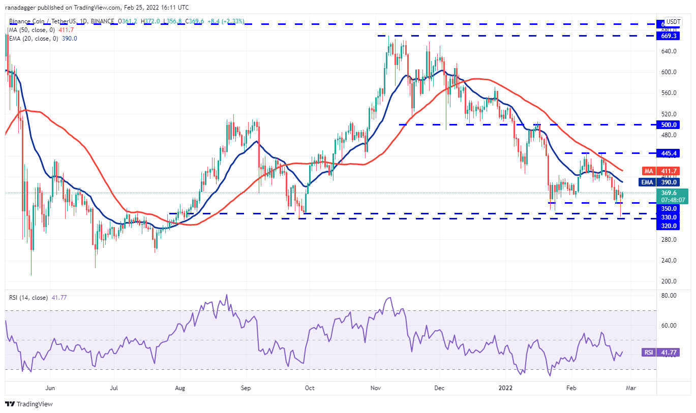 The bulls are attempting to propel the price to the moving averages where the bears are expected to mount a strong defense. If the price turns down from the moving averages, the bears will again attempt to sink and sustain the BNB/USDT pair below $350 and challenge the support zone.