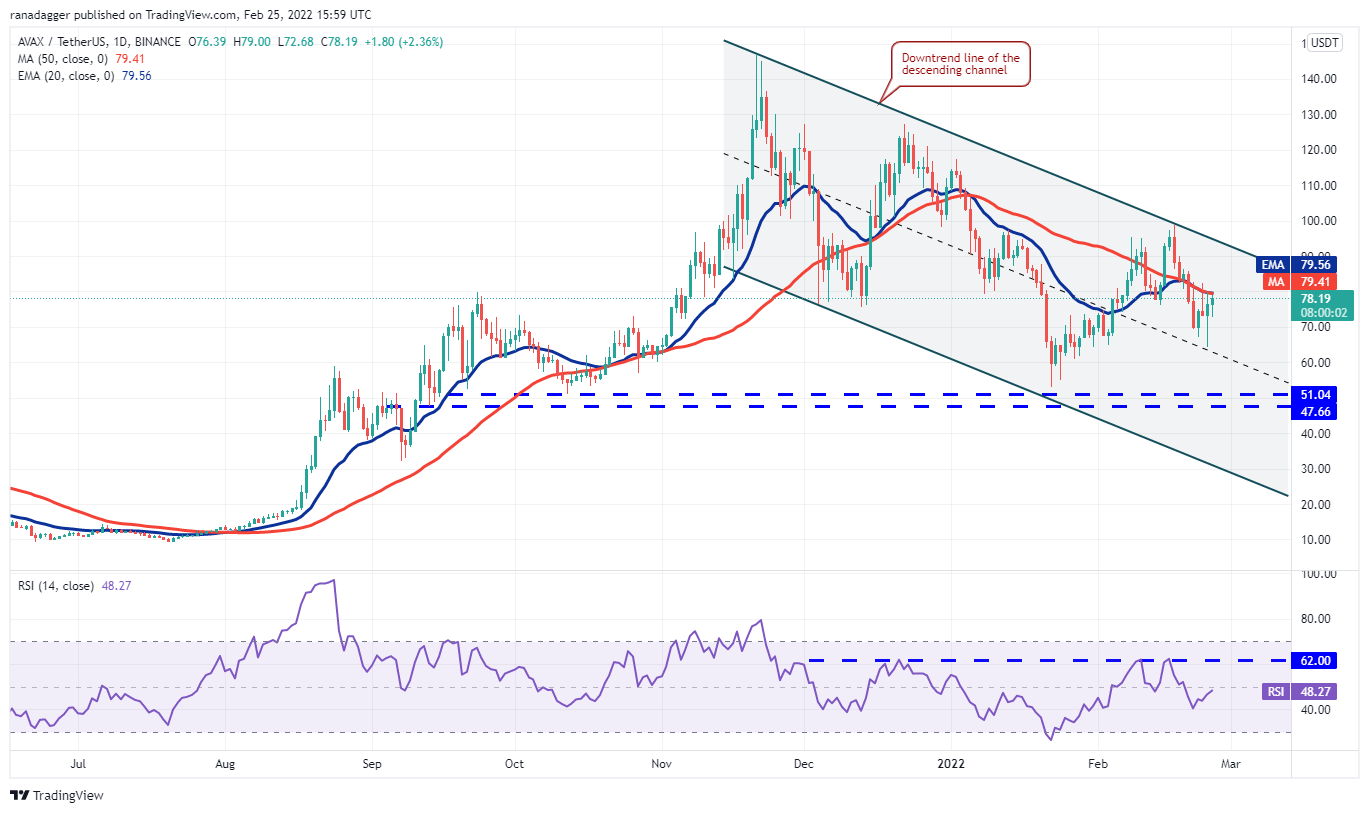 Avalanche (AVAX) attempted to rise above the moving averages on Feb. 23 but the long wick on the day’s candlestick indicates strong selling at higher levels. The bears pulled the price to $64 on Feb. 24 but the bulls bought this dip. This suggests that bears are selling on rallies while bulls are buying on dips.