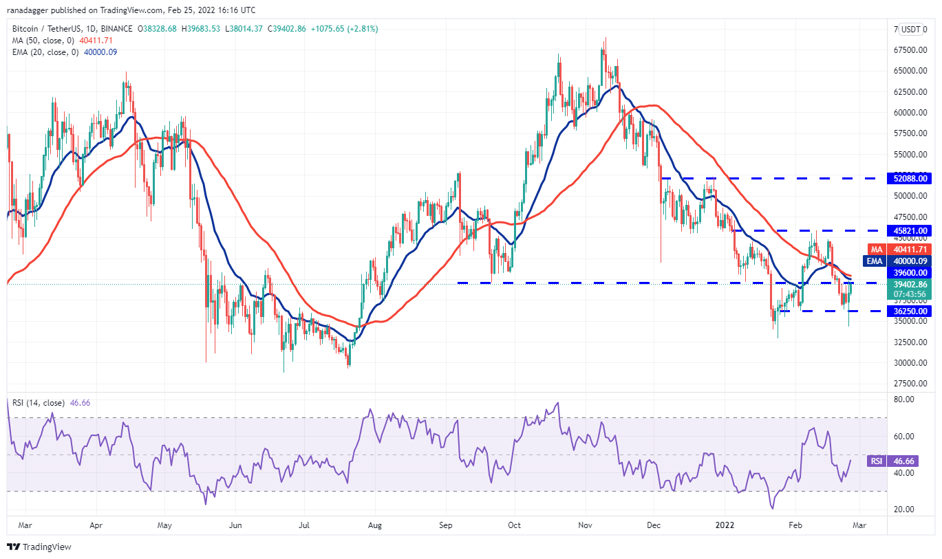 Bitcoin formed an outside-day candlestick pattern on Feb. 24. The bears pulled the price below the immediate support at $36,250 but the long tail on the day’s candlestick indicates strong buying by the bulls at lower levels.