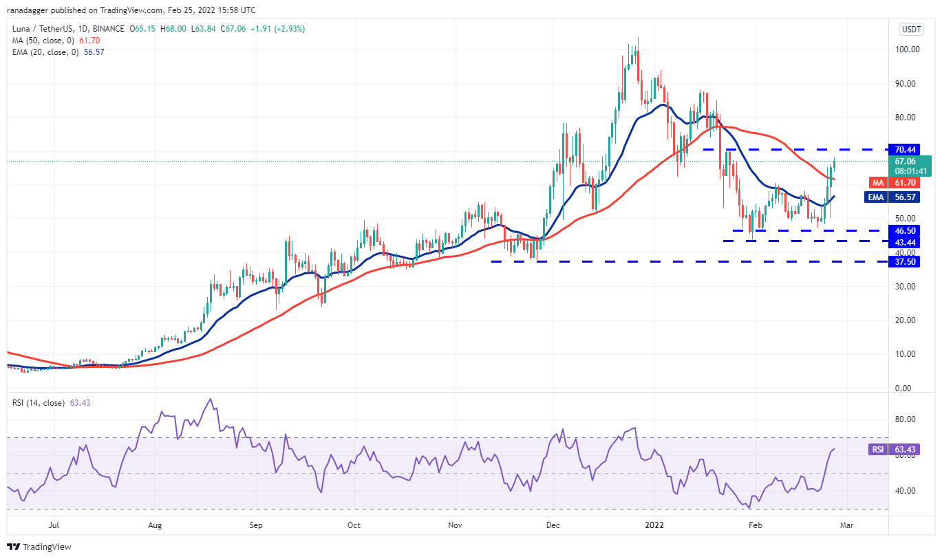 Terra’s LUNA token formed an outside-day candlestick pattern on Feb. 24. Although the bears pulled the price back below the 20-day exponential moving average (EMA) ($56), they could not sustain the lower levels.