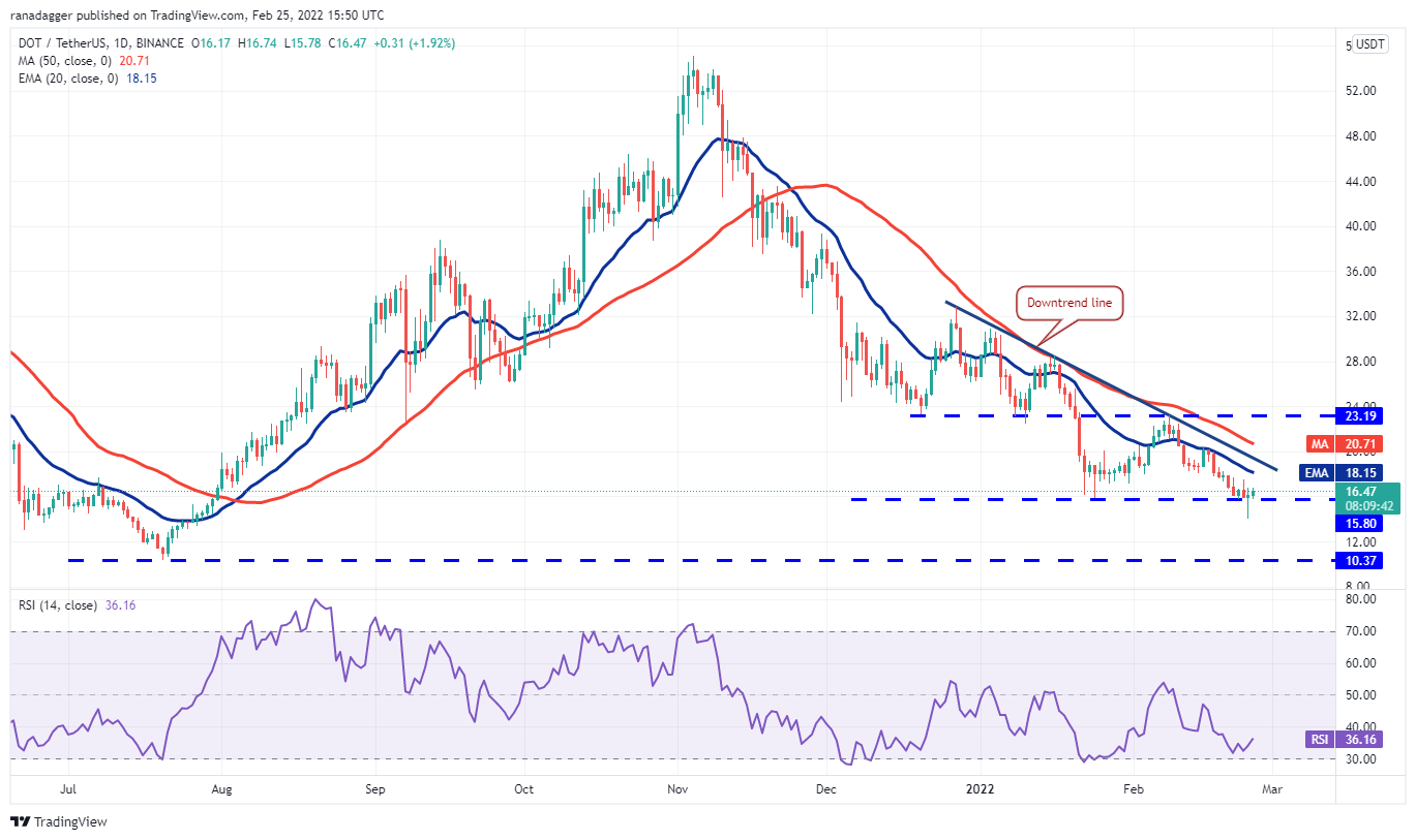 Polkadot (DOT) plunged below the strong support at $15.80 on Feb. 24 but the bears could not sustain the lower levels, as seen from the long tail on the day’s candlestick. This indicates strong buying at lower levels.