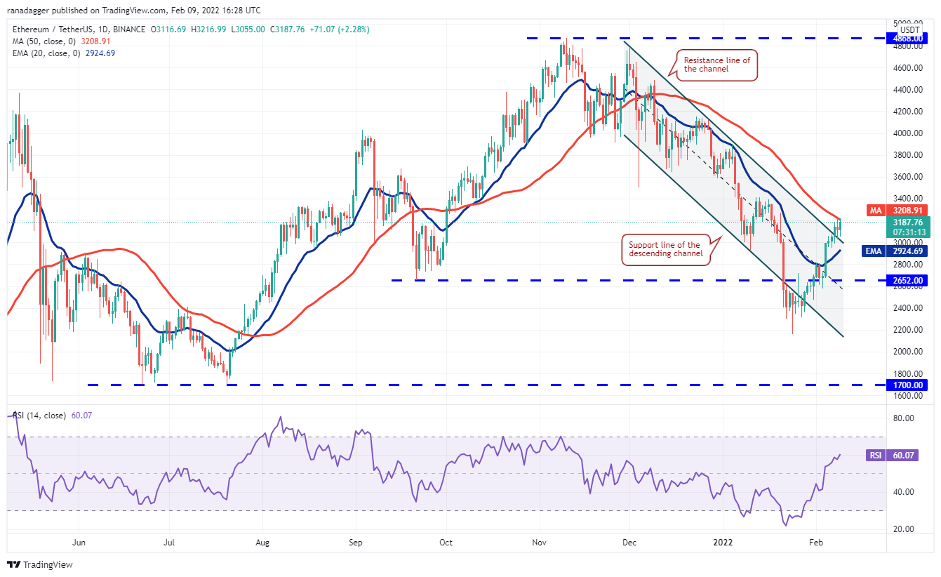 Ether (ETH) broke and closed above the resistance line of the channel on Feb. 7 which is an indication that the downtrend could be over. Although bears defended the 50-day SMA ($3,208) on Feb. 8, they have not been able to pull the price back into the channel.