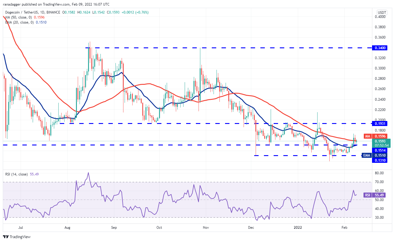 Dogecoin (DOGE) broke and closed above the 50-day SMA ($0.15) on Feb. 7 but the bulls could not build upon this advantage. The bears pulled the price back below the 50-day SMA on Feb. 8, indicating that they have not given up yet.