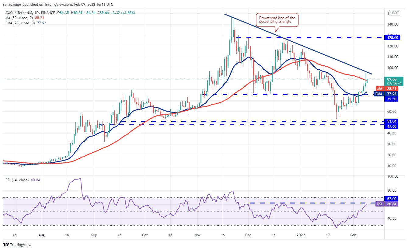 Avalanche (AVAX) soared on Feb. 8 to reach the downtrend line but the long wick on the day’s candlestick shows that bears are defending the overhead resistance aggressively. The bulls regrouped quickly and are attempting to push the price above the 50-day SMA ($88).