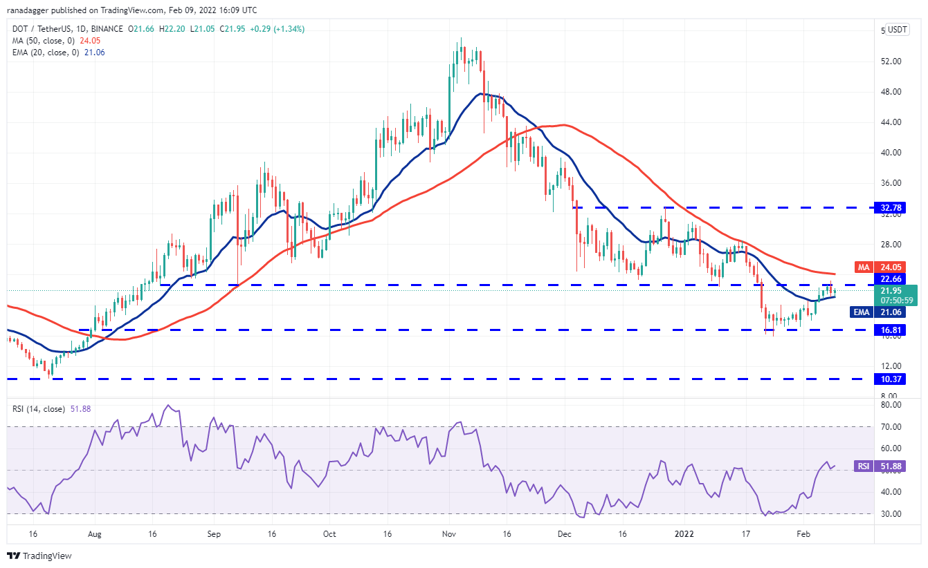 Polkadot (DOT) tried to rise above the zone between $22.66 and the 50-day SMA ($24.05) on Feb. 8, but the bears were in no mood to relent. A minor positive is that the bulls have not allowed the price to break below the 20-day EMA ($21.06).